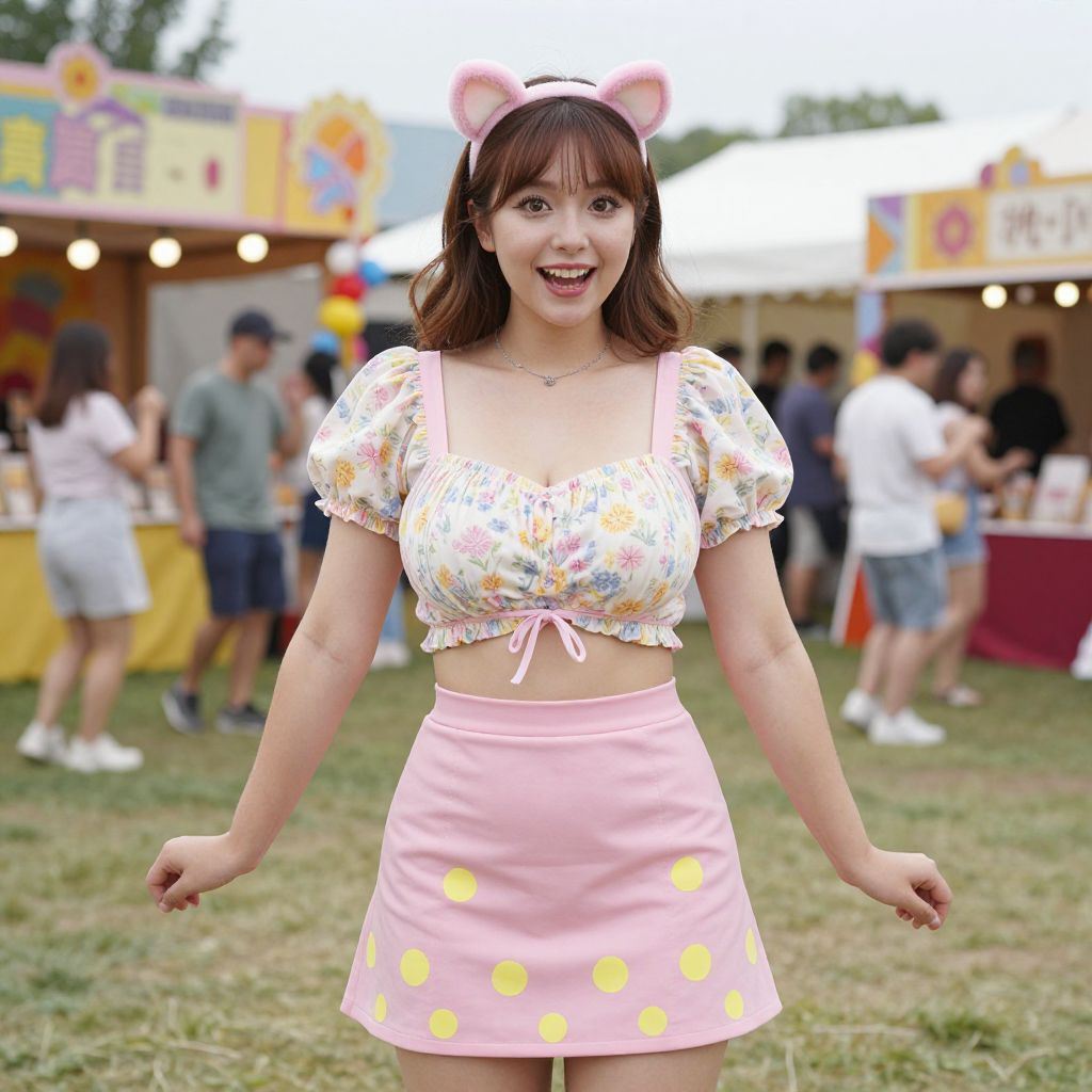 Photograph of an Asian woman with fair skin and long brown hair, wearing a white, floral crop top with puffed sleeves and a pink, high-waisted skirt adorned with yellow polka dots. She has on a white headband with pink cat ears and is smiling with her mouth open. The background shows a lively outdoor fair with colorful booths, blurred people, and string lights. The grassy field is visible beneath her feet. The overall scene is bright and cheerful, with a playful, festive atmosphere.