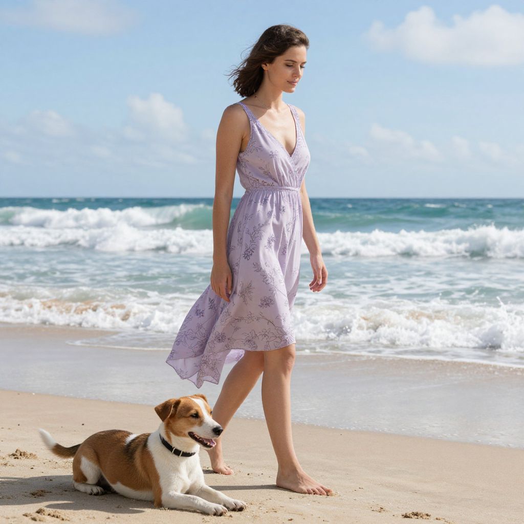 A dress-clad woman walks barefoot along the sandy seashore, wearing a light lavender dress with floral patterns, her face turned slightly toward the ocean, eyes softly focused on the incoming waves; a friendly mixed-breed dog, with a brown and white coat, rests beside her, its tail wagging gently; the background shows a gentle sea breeze, foam from waves, and a clear blue sky with scattered clouds.