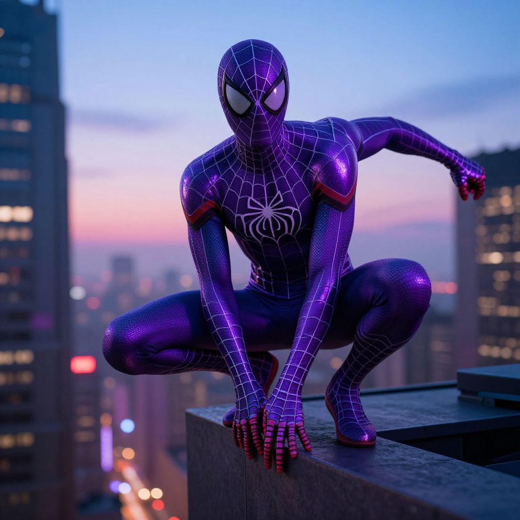 A detailed close-up of Miles Morales in his Spider-Man costume, standing in a urban cityscape at night, with glowing red and blue eyes reflecting the city lights