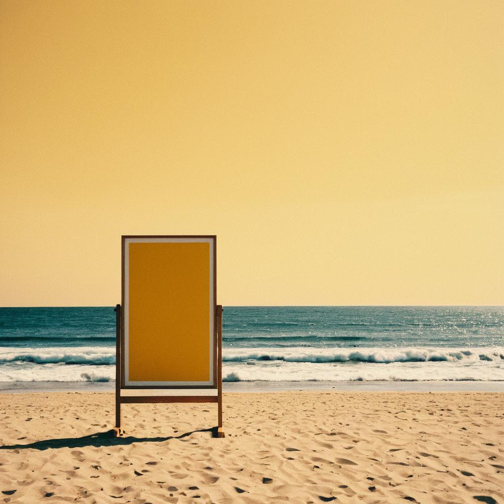 A poster with an summer and beach, in the style of sunny gold palette. Richly colored skies, naturecore, minimalistic bentwood design, Olympus XA2 aesthetic.