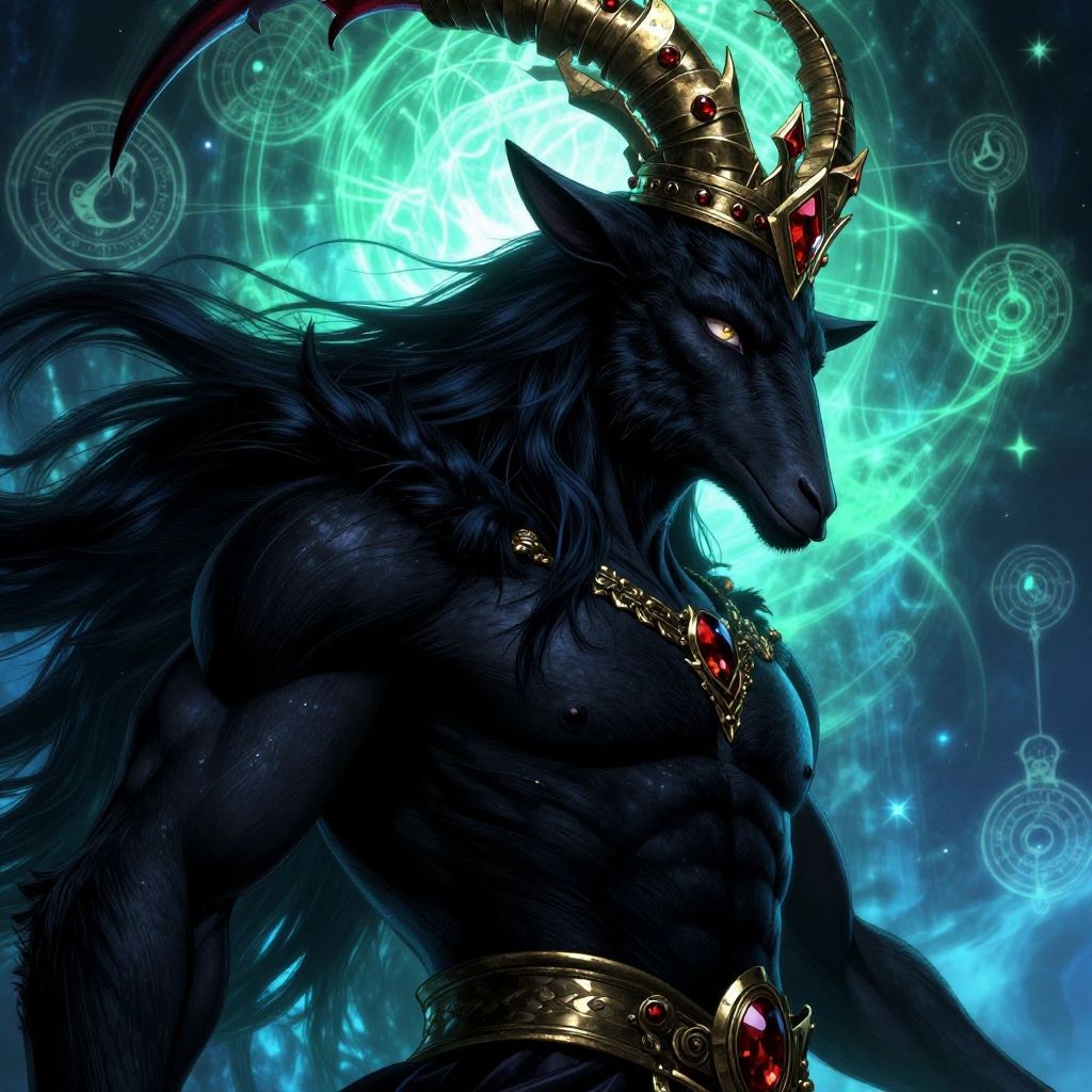 Digital artwork of a dark, muscular, anthropomorphic goat-like creature with black fur and glowing yellow eyes. It wears a golden crown adorned with red gems and a matching ornate belt. The creature's long, flowing black hair contrasts with the bright, glowing blue and green magical background, which features circular, mystical patterns. The creature's strong, defined muscles and imposing presence dominate the image, with a sense of power and mysticism conveyed through the vivid colors and intricate details.