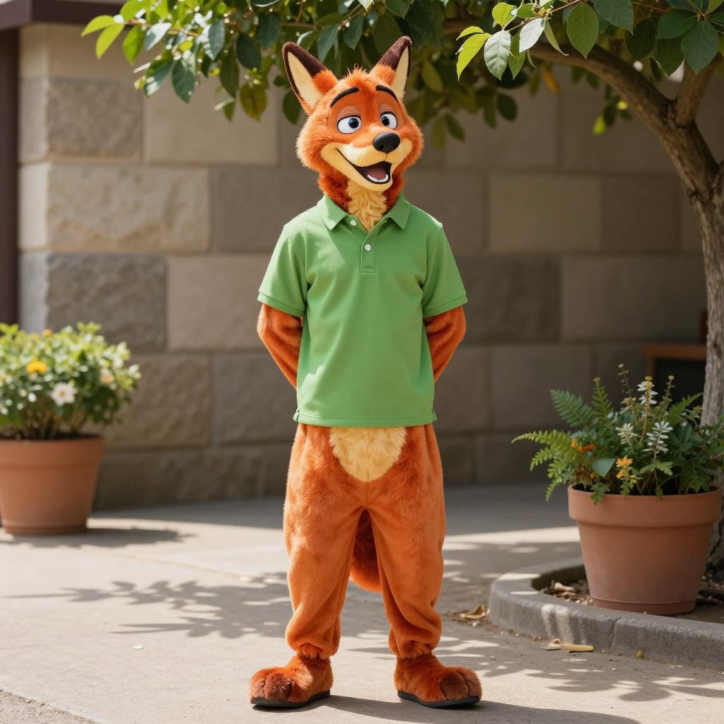 Adult fred scooby doo, photograph of a young boy standing outdoors, wearing an orange furry costume with fox ears, green polo shirt, and orange pants, hands behind his back, potted plants on either side, stone wall in background, sunny day, green tree branches overhead, paved path, casual setting