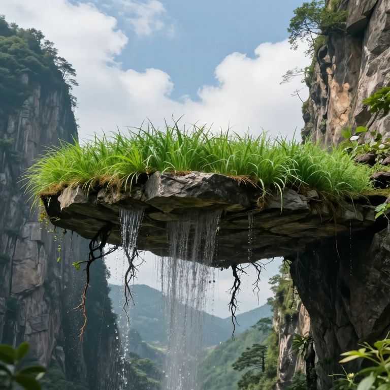 Lush green grass sprouts defiantly from the inverted underside of a suspended stone platform, cascading roots and waterfalls defying gravity as they pour upwards into a serene, cloud-dotted sky framed by towering cliffs.