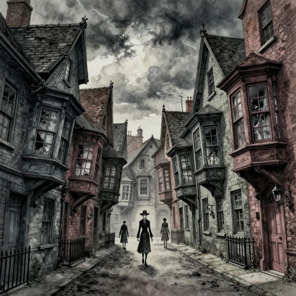 A Tim Burton filter effect on a vintage cityscape with narrow alleys, leaning crooked buildings with strange windows, lonely figures in Victorian attire, under a cloudy, stormy sky, detailed with ink and watercolor textures blending gothic horror and bizarre whimsy.