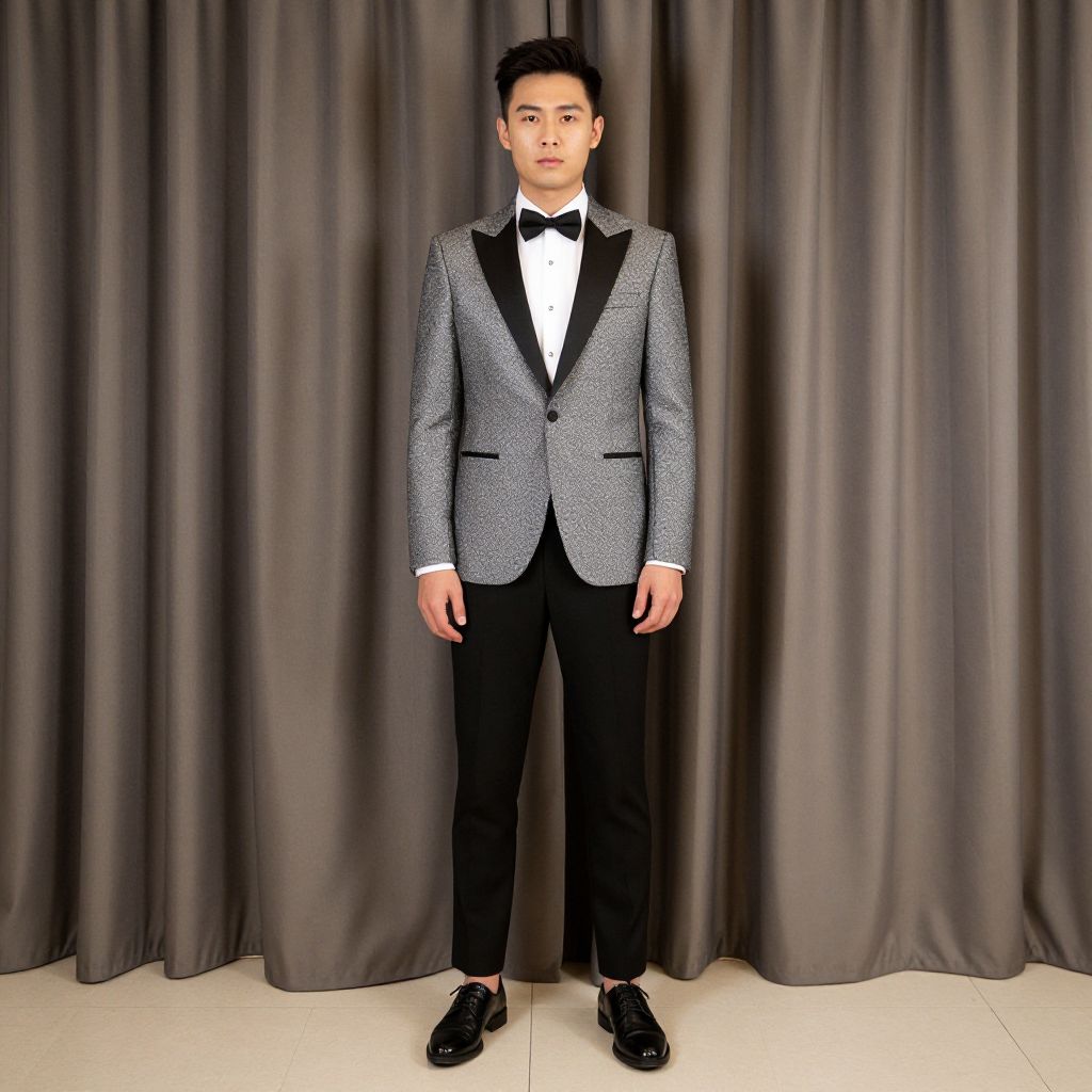 Photograph of an Asian man standing straight in front of gray curtains. He has short black hair and a neutral expression. He is wearing a gray, patterned blazer with black lapels over a white dress shirt, paired with a black bow tie and black dress pants. His black dress shoes are polished. The background is plain with the gray curtains covering the entire width, and the floor is light beige. The image has a formal, studio-like quality with even lighting and sharp focus.
