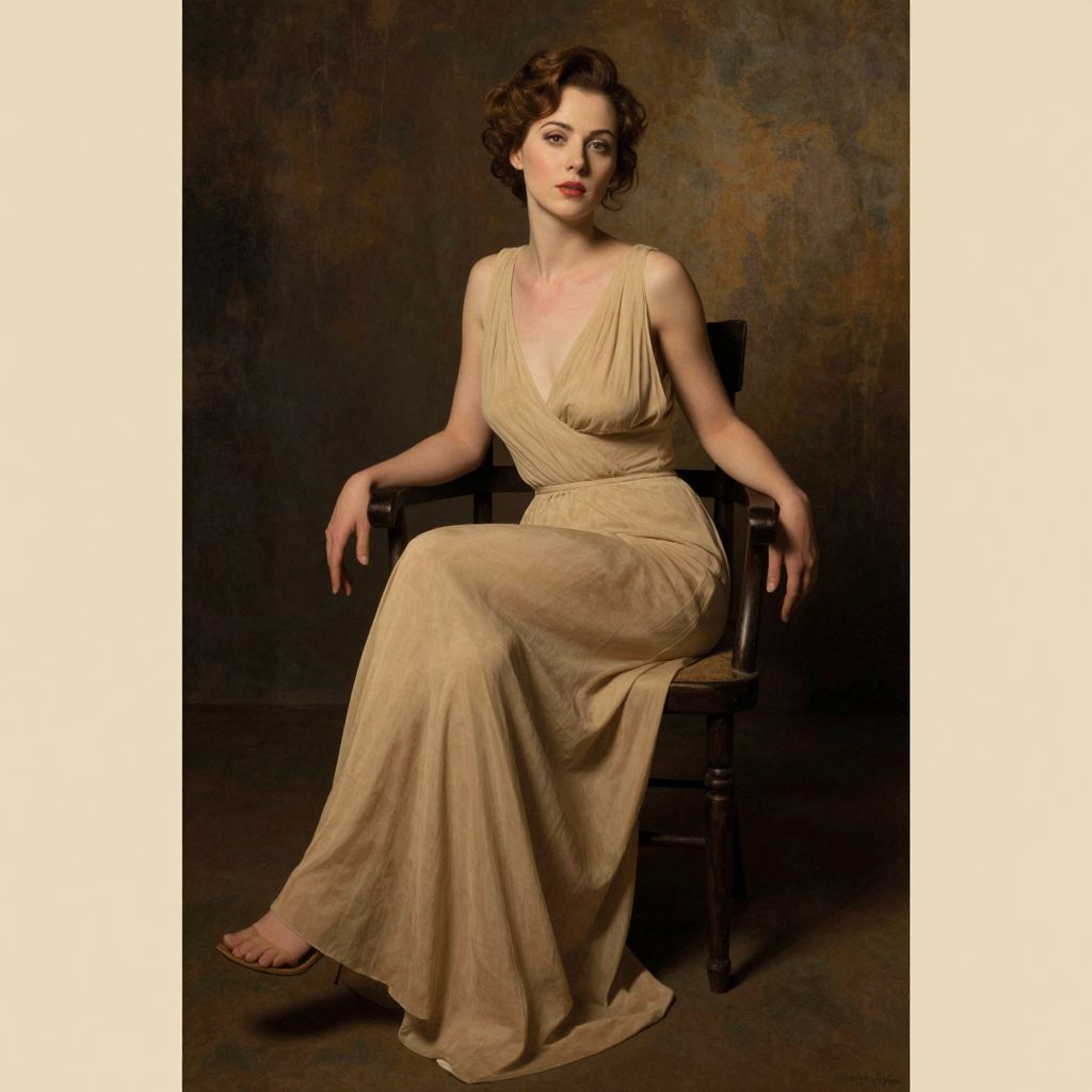 Photograph of a fair-skinned woman with wavy brown hair, sitting on a dark wooden chair against a textured, brown and black background. She wears a flowing, beige, V-neck, sleeveless dress that drapes elegantly over her slender frame. Her red lipstick contrasts with her soft features. She has one arm resting on the chair's armrest and the other on her lap, with her left foot crossed over her right. She wears simple, beige flat sandals. The lighting highlights her face and dress, creating a dramatic, vintage ambiance.