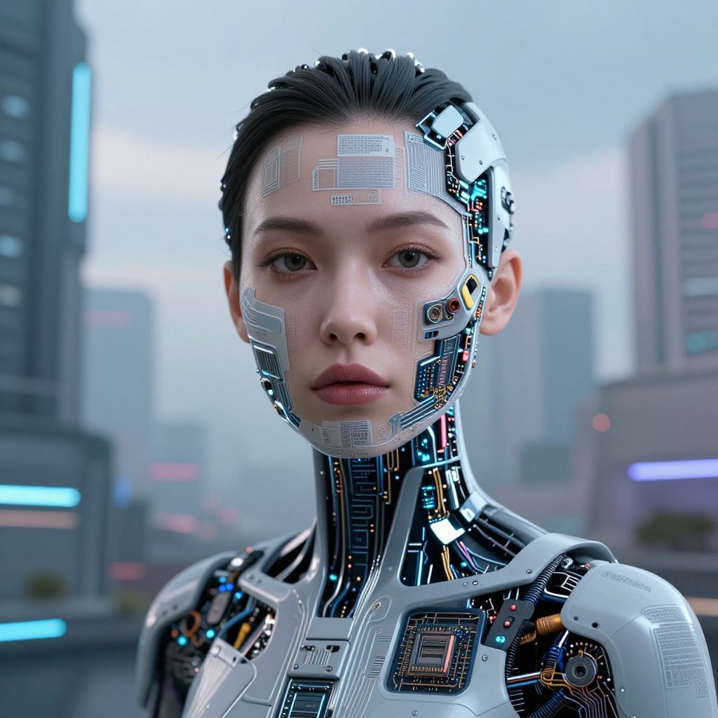 A futuristic, cybernetic woman with a face made of printed circuits and electronic components, set against a background of virtual reality and dystopian urbanism, reflecting the interstitial dissonance and mutations of artificial general intelligence.