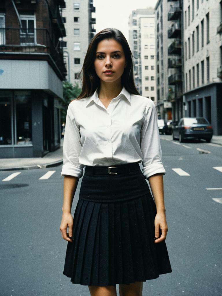 Black Skirt Work Outfit, woman in a skirt and shirt standing on a street with buildings in the background