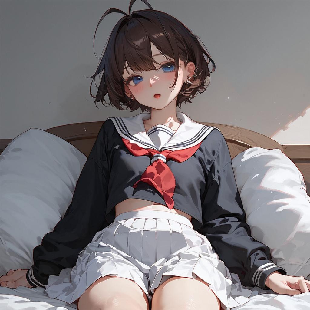 This digital anime-style drawing depicts a young girl with short, wavy black hair and large blue eyes, sitting on a bed. She wears a navy blue sailor school uniform with a red necktie and a white pleated skirt. The girl's skin is fair, and she has a slight blush on her cheeks. She is leaning back against a wooden headboard with white pillows on either side. The background is a simple, light grey wall. The lighting is soft, casting gentle shadows and highlights, creating a calm, intimate atmosphere. The artist uses detailed shading and highlights to emphasize the girl's expression and the texture of her uniform and pillows.