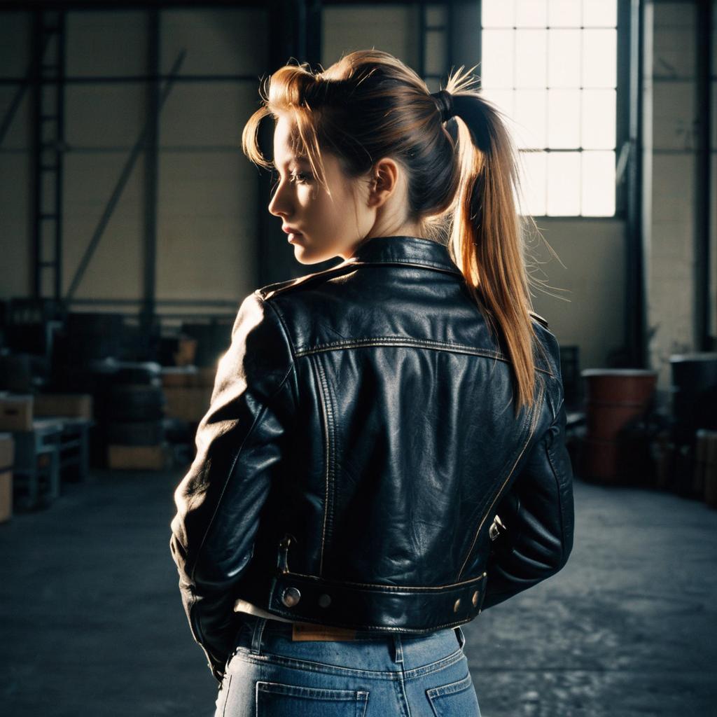 Young woman with double ponytail hairstyle wearing a vintage black leather jacket and blue jeans, standing in an industrial warehouse. The image is captured with soft backlighting highlighting her profile and the texture of the leather jacket, creating a fashion editorial style.