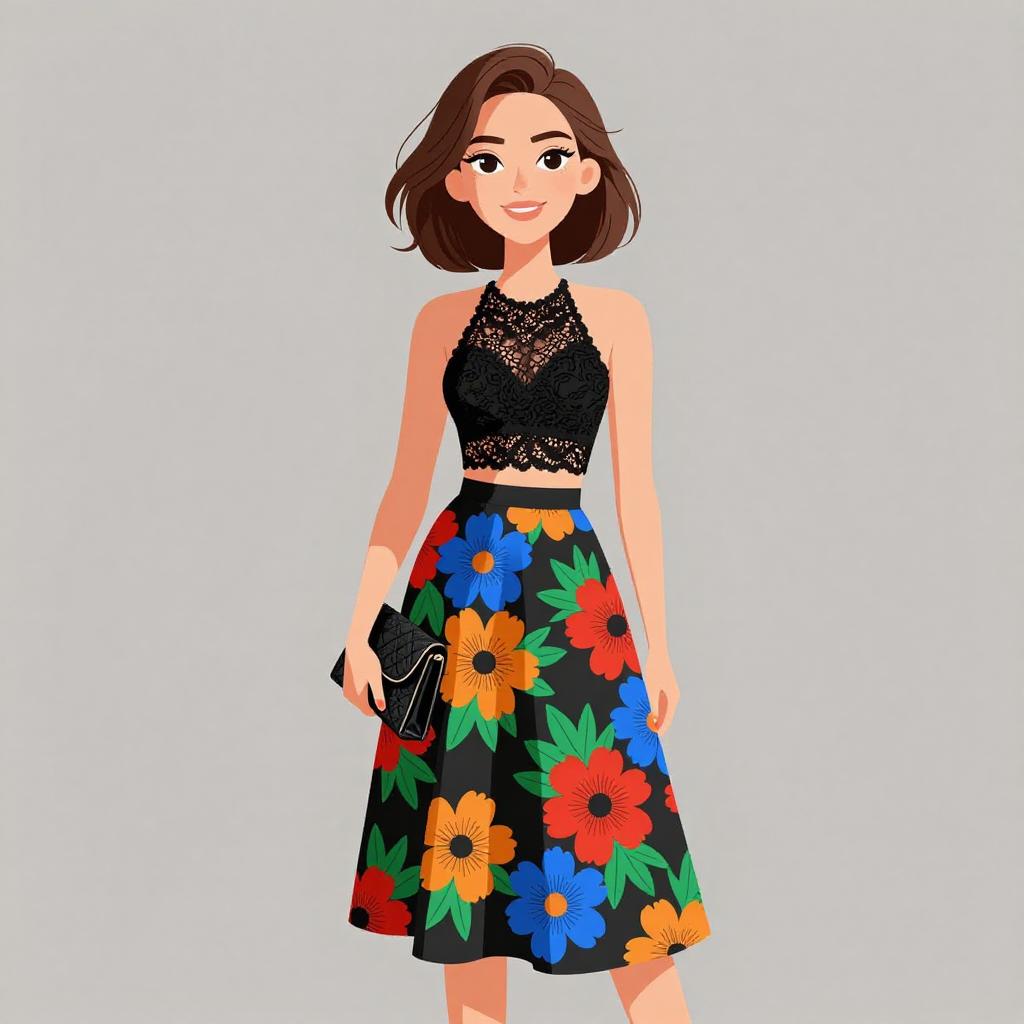Woman with pretty face and pretty hair. smiling Woman, summer clothing, black lace crop top with halter neckline, A-line midi skirt with vibrant floral print, colors include red, blue, orange, and green on a black background, sleeveless top, black clutch with texture. --sref 1467