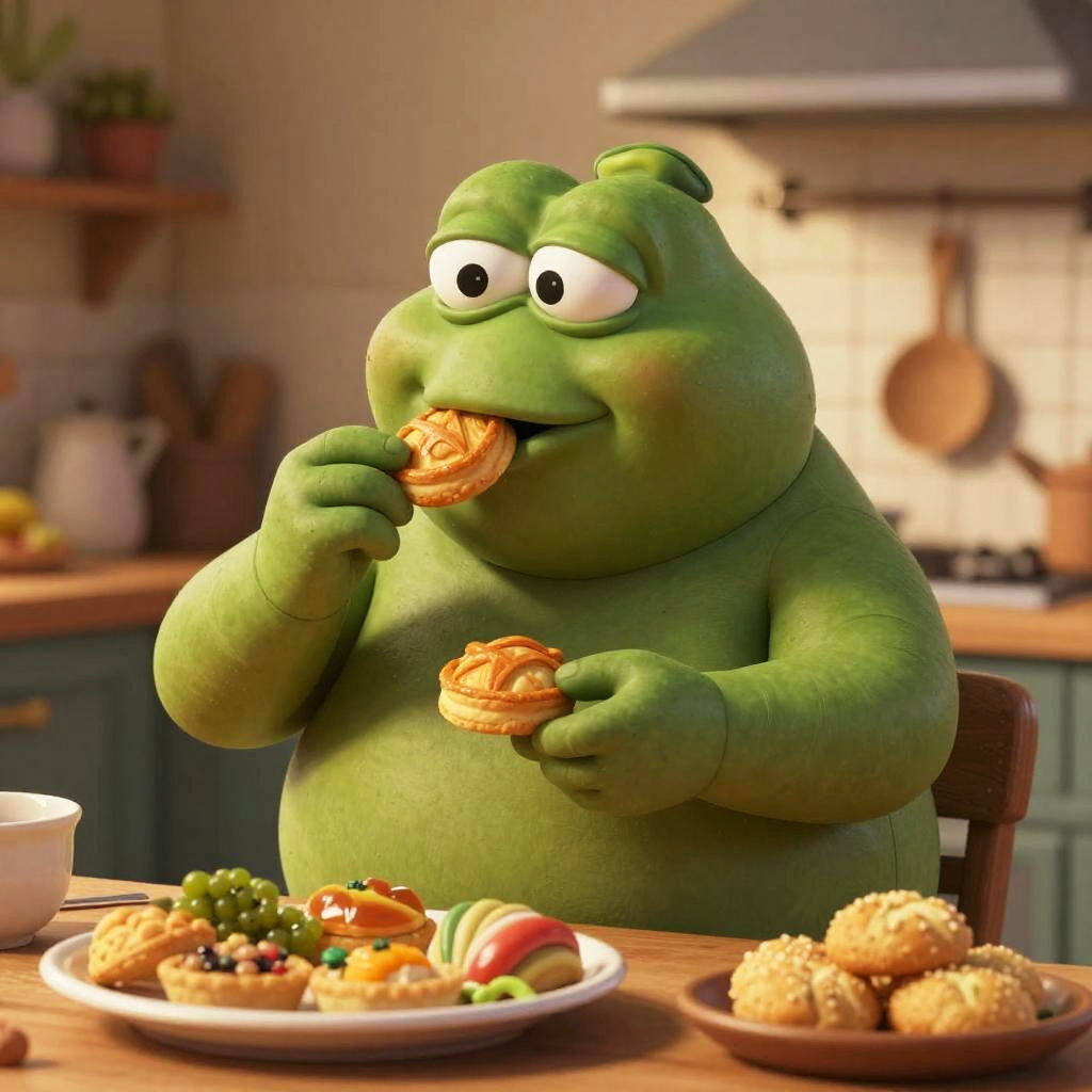 Pepe fat enjoying a feast, round and plump body, soft shadows, cozy kitchen setting, warm tones, highly detailed, humorous and lighthearted mood
