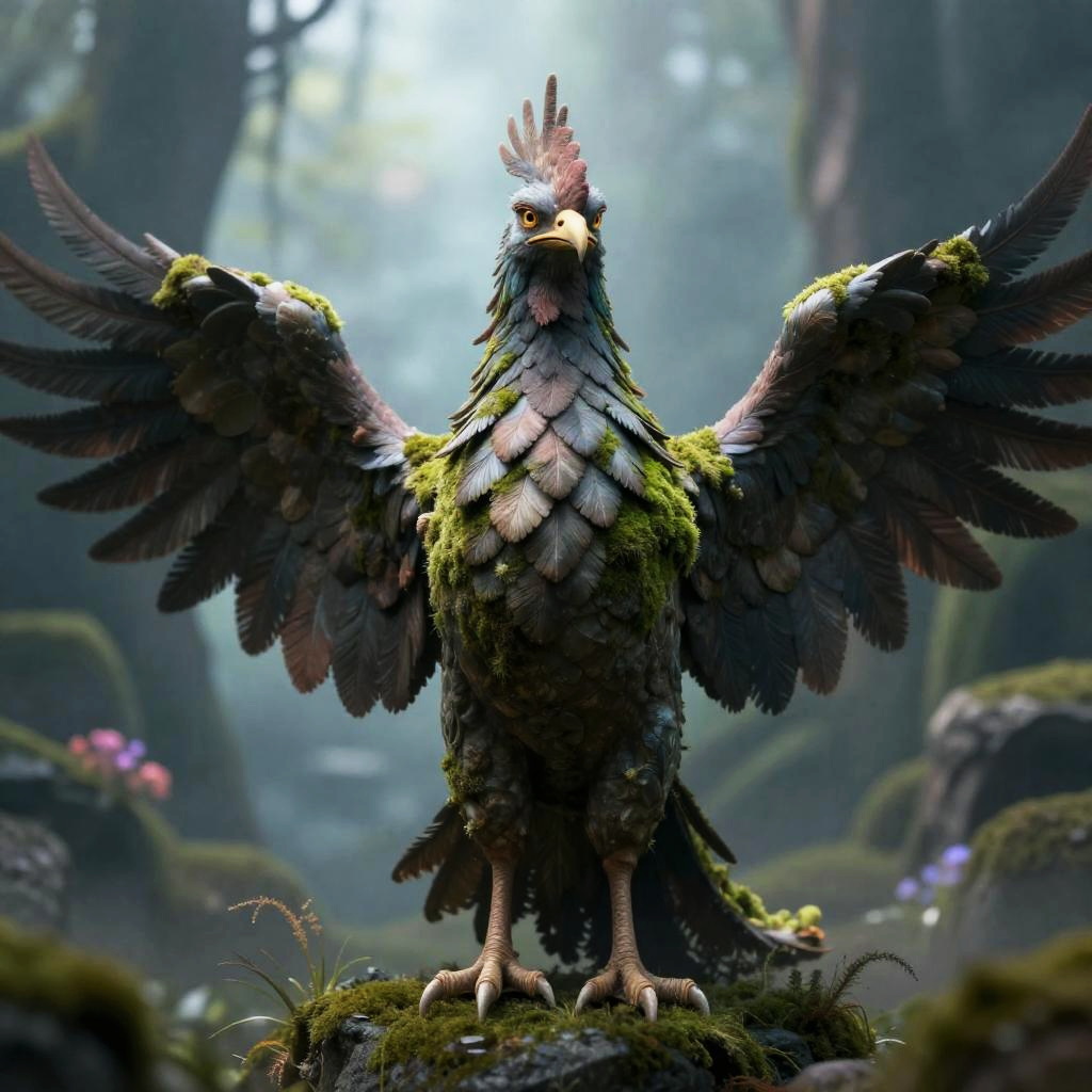Moss-Covered Stone Phoenix in Enchanted Realm