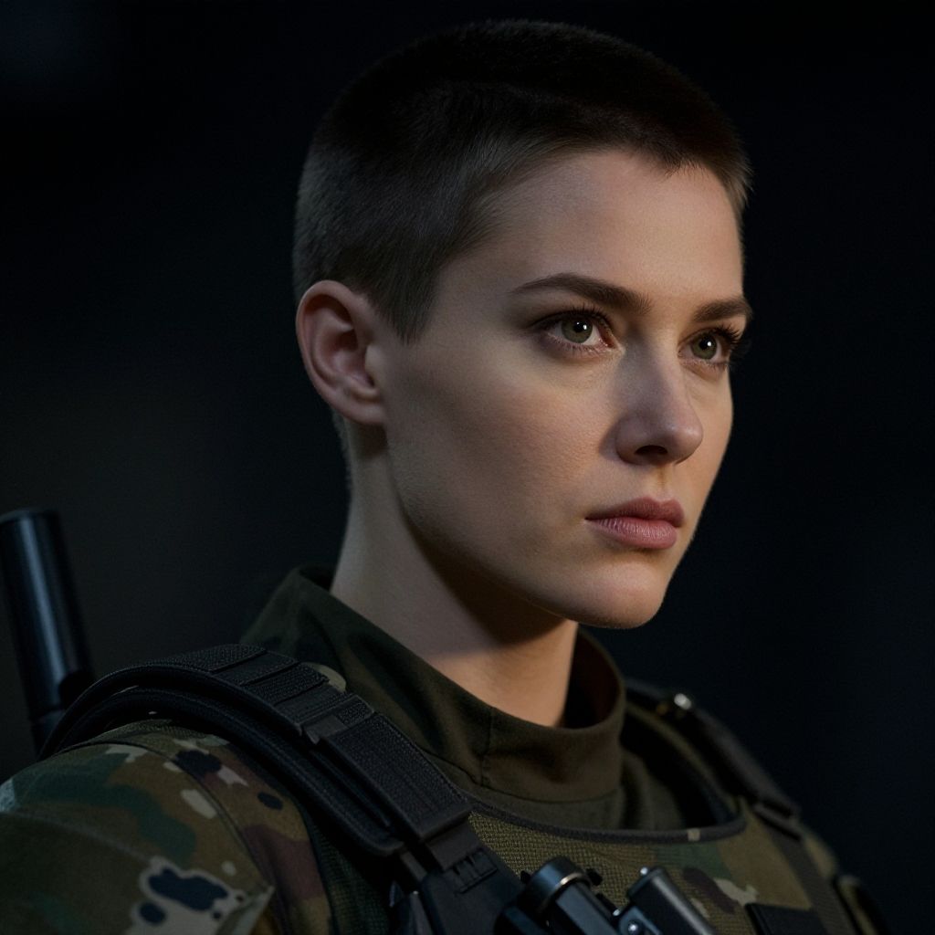 Photograph of a serious-looking young woman with short, dark brown hair and fair skin. She has light blue eyes and is dressed in a military-style camouflage uniform with a black tactical vest. The background is dark, highlighting her face and upper body. Her expression is focused and determined. The lighting accentuates her facial features, casting subtle shadows. The image has a realistic, high-contrast style, emphasizing her strong, stoic appearance.