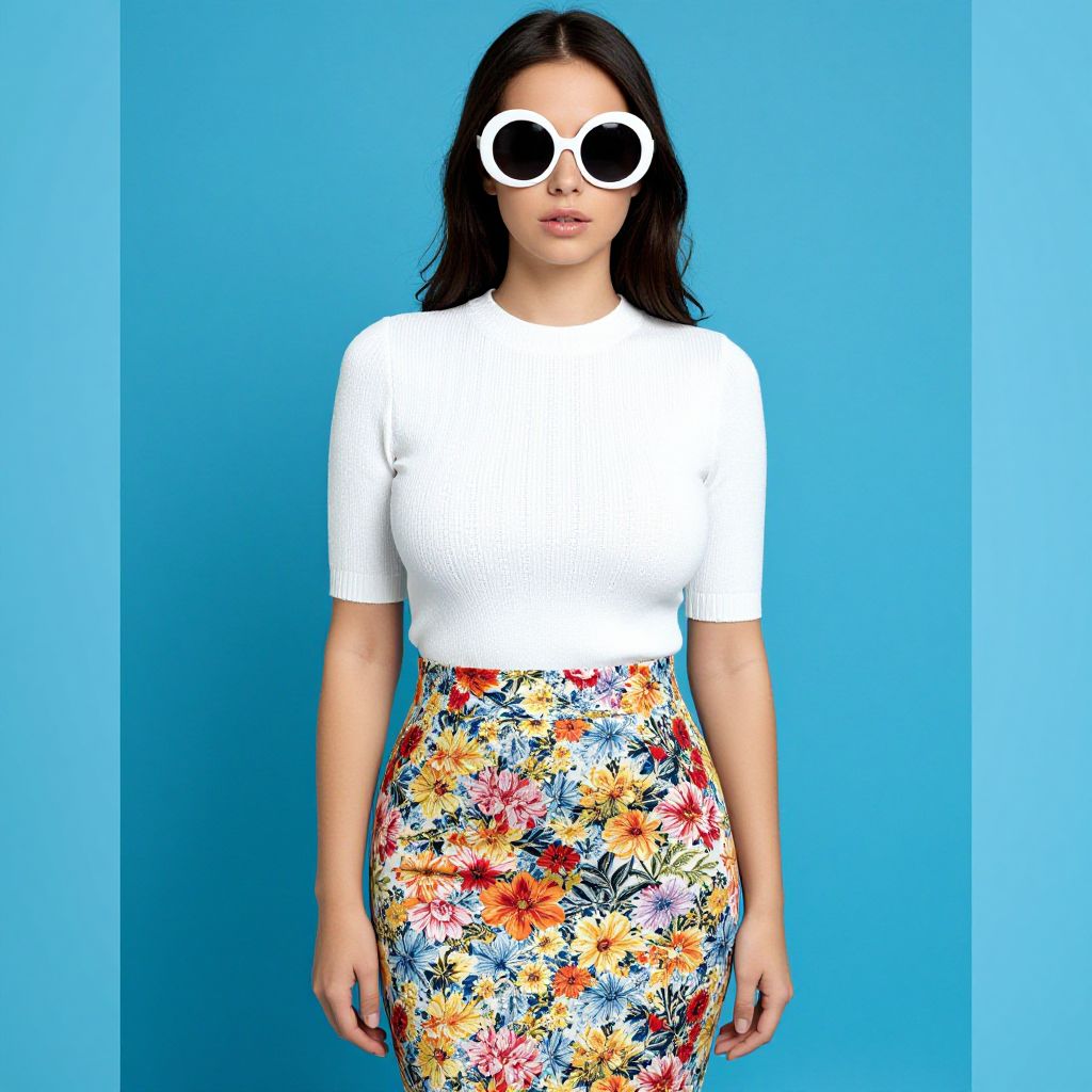 "Woman, casual chic, white short-sleeved knit top, crew neck, floral print skirt, pencil cut, knee-length, vibrant colors against a blue background, oversized white sunglasses with round frames.. Sexy. Pretty face and beаutiful eyes. Big breasts."