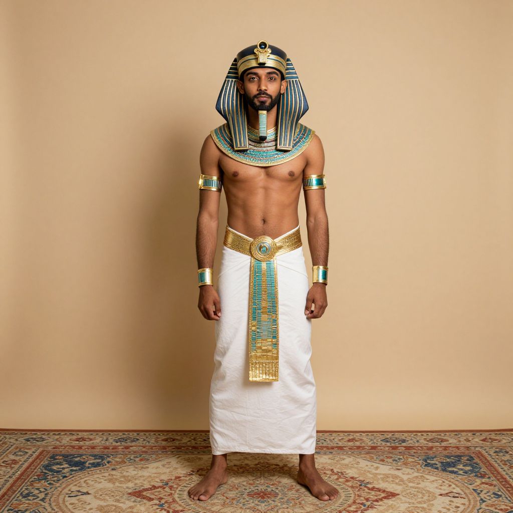 Photograph of a Black man with a trimmed beard, dressed as an ancient Egyptian pharaoh, standing on a patterned rug against a beige wall.