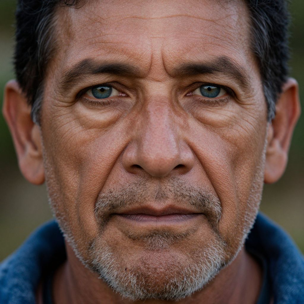 Craft a photorealistic portrait of a middle-aged Latin American man with a rugged visage, exuding wisdom and resilience. Capture his features from an insect's perspective, emphasizing intricate details like intense blue eyes that hint at mystery and introspection, as well as a graying beard and lined skin, testaments to life's experiences. The composition should evoke empathy and admiration for this intriguing character who has weathered much yet remains spirited.