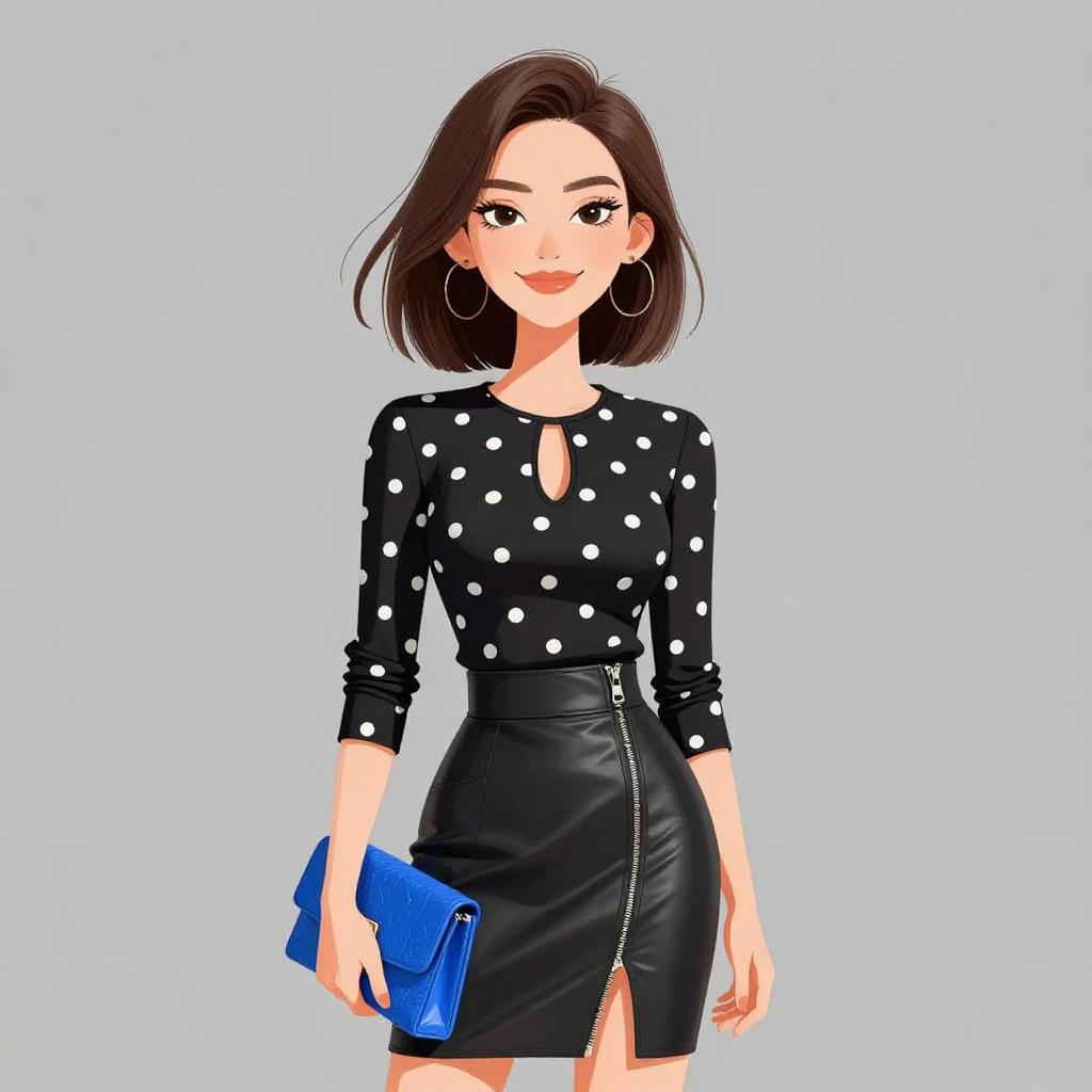 Digital illustration of a fashionable young woman with a short brown bob hairstyle and hoop earrings. She is wearing a black polka-dot top with a keyhole neckline and half sleeves, paired with a high-waisted black faux leather asymmetrical zip skirt. The woman holds a textured cobalt blue clutch, smiling confidently against a plain gray background.