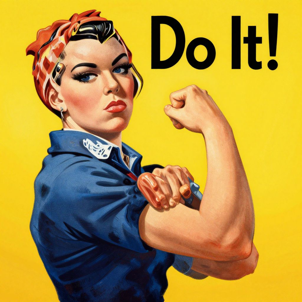 A vibrant digital illustration inspired by Norman Rockwell's iconic \"Rosie the Riveter,\" featuring a bold, retro-style depiction of a confident woman flexing her arm, set against a striking yellow background with dramatic lighting and a motivational \"Do It!\" slogan.