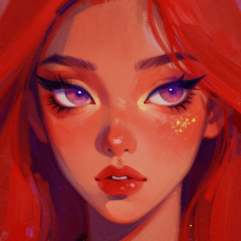 This digital illustration in a vibrant, semi-realistic style features a close-up of a young woman with striking red hair and large, vivid purple eyes. Her skin is a warm, pinkish-red with subtle freckles, and she has full, glossy red lips slightly parted. She has bold, dark eyebrows and long, black eyelashes accentuating her eyes. A small, golden spark is visible on her right cheek. The background is a gradient of red and purple hues, enhancing the image's dramatic and intense atmosphere. The overall texture is smooth with visible brush strokes, adding a painterly effect to the artwork.