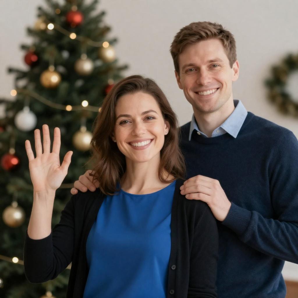 Two men standing in front of a decorated Christmas tree with presents. Both wear plaid jackets, one in red shirt and plaid pants, the other in blue shirt and beige pants. One man gestures, both smile. Christmas lights and garlands in background.