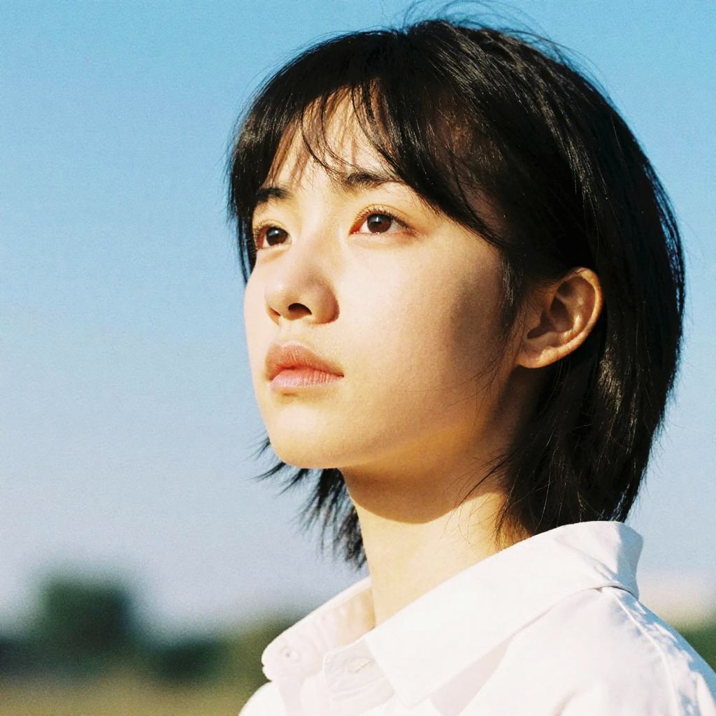 1girl, solo, blurry background, black hair, outdoors, light on face, blurry, black eyes, upper body, lips, day, sky, realistic, blue sky, shirt, white shirt, short hair, jacket, closed mouth, looking to the side, Zhenxin, best quality, photo \(medium\), (extremely detailed face:1.2), (extremely detailed eyes:1.2), epic, gorgeous, film grain, grainy, highly detailed, detailed skin texture