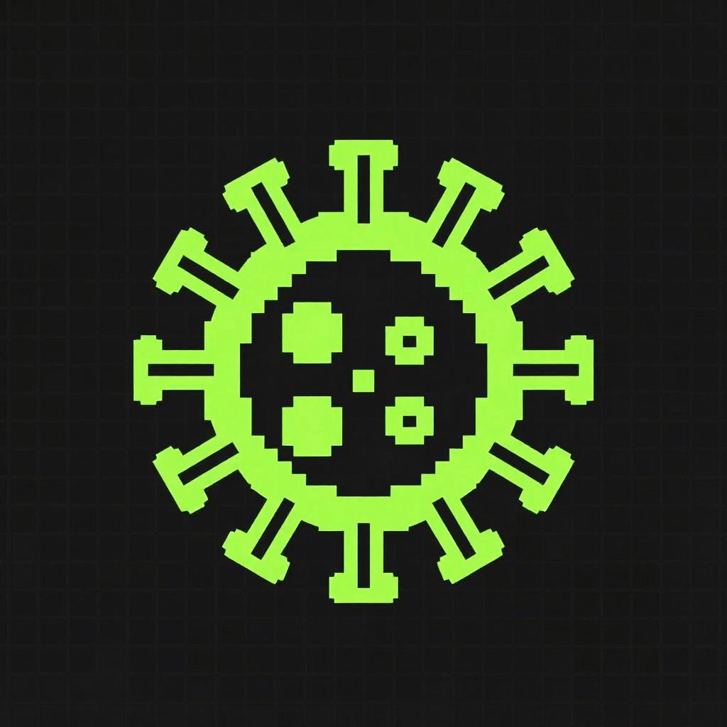 Pixel art of a neon green, sun-like virus symbol with radial spikes and a small, pixelated face on a black background.