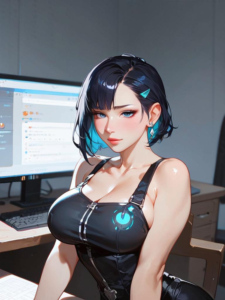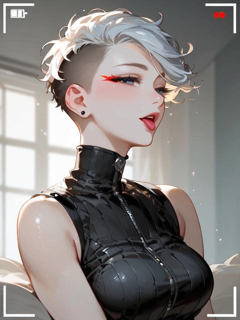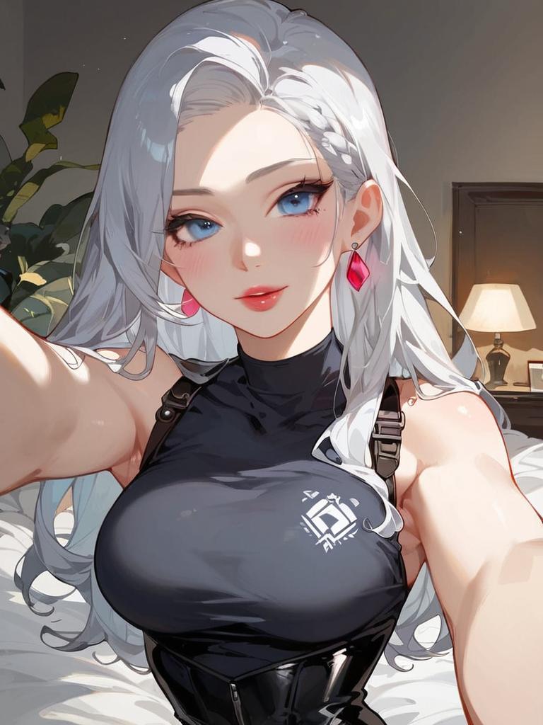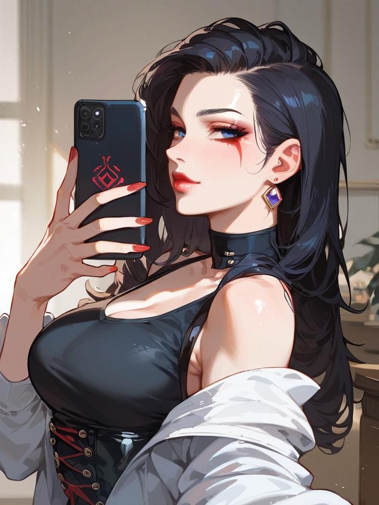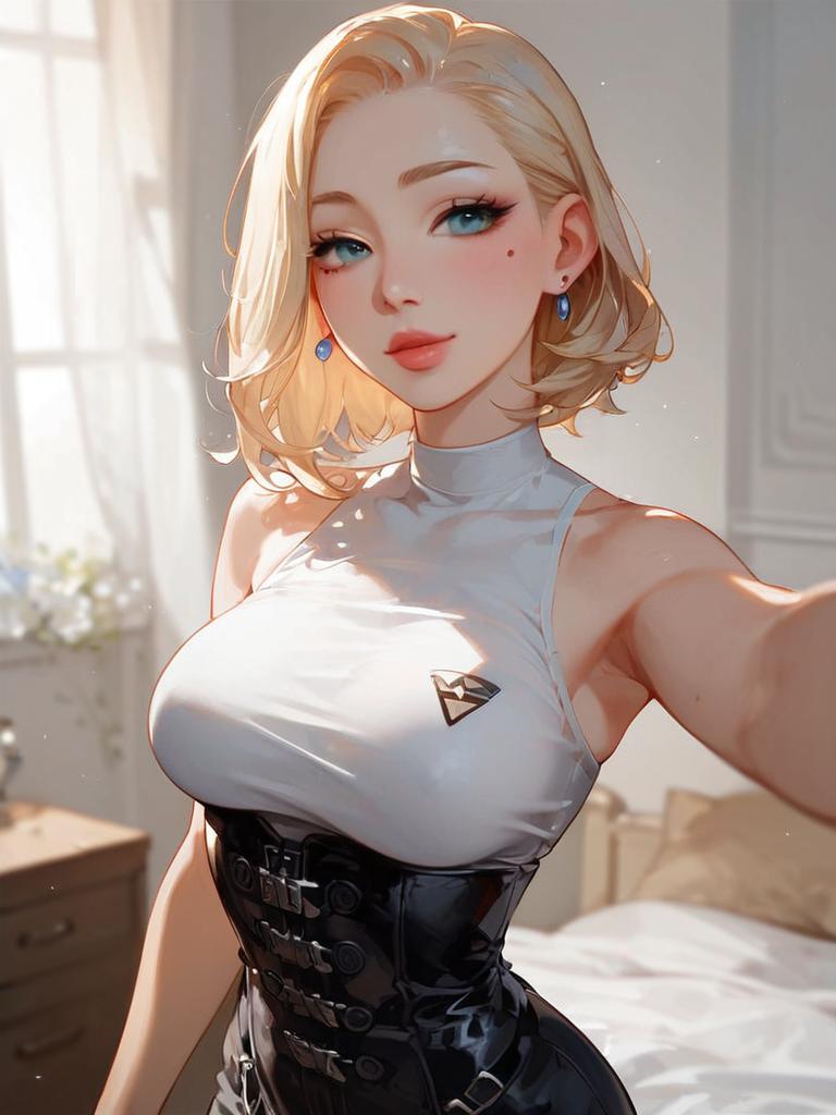 1girl woman wearing faux leather corset tank top with sci-fi control-panel print and structured seams paired with minimal low-rise briefs in obsidian black with holographic circuitry pattern on slender woman with asymmetrical haircut and glossy lips posed leaning back in the chair with arm extended to take the selfie in apartment bedroom corner with dresser and piles of clothing under bright white LED lighting illuminating face and outfit, playful sci-fi inspired cosplay portrait photography, high resolution, ultra-detailed