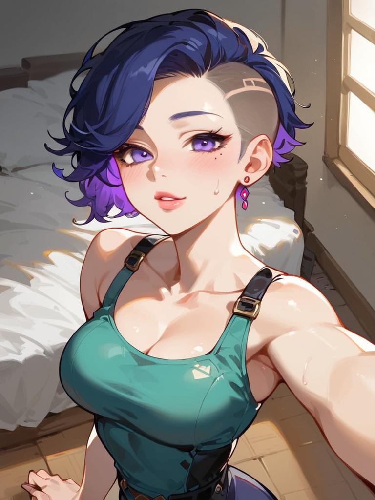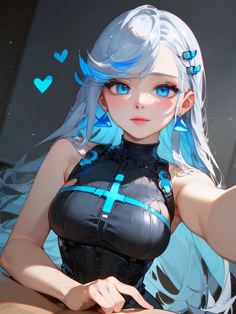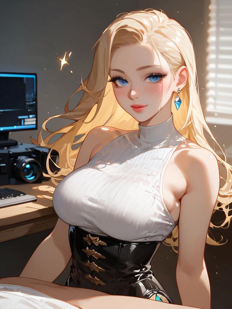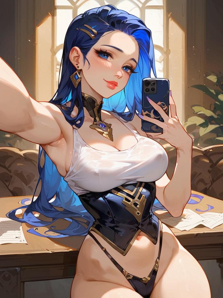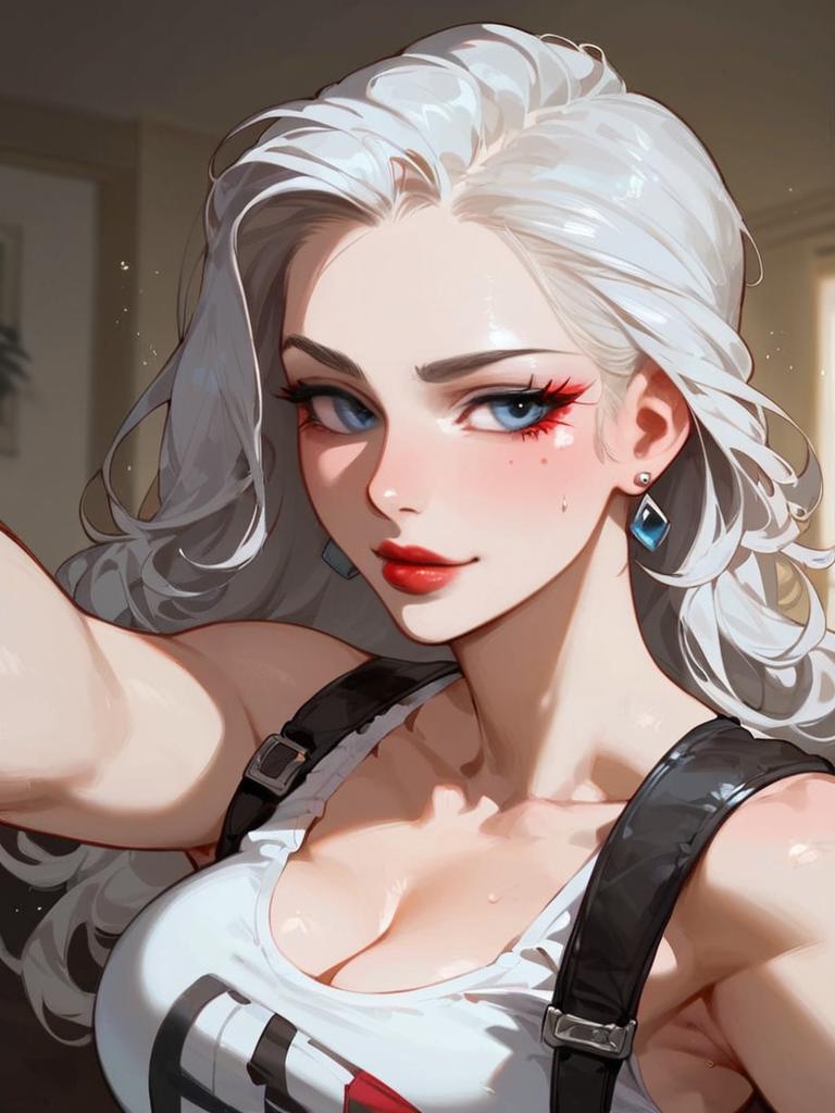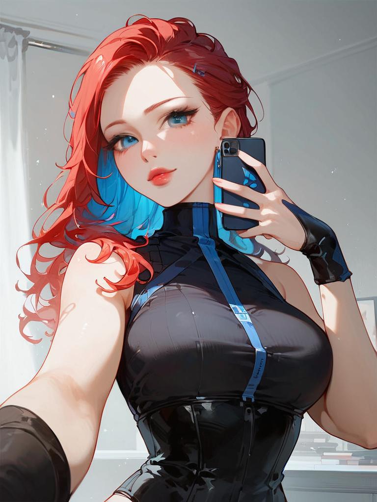 1girl woman wearing faux leather corset tank top with sci-fi control-panel print and structured seams paired with minimal low-rise briefs in obsidian black with holographic circuitry pattern on slender woman with asymmetrical haircut and glossy lips posed leaning back in the chair with arm extended to take the selfie in apartment bedroom corner with dresser and piles of clothing under bright white LED lighting illuminating face and outfit, playful sci-fi inspired cosplay portrait photography, high resolution, ultra-detailed