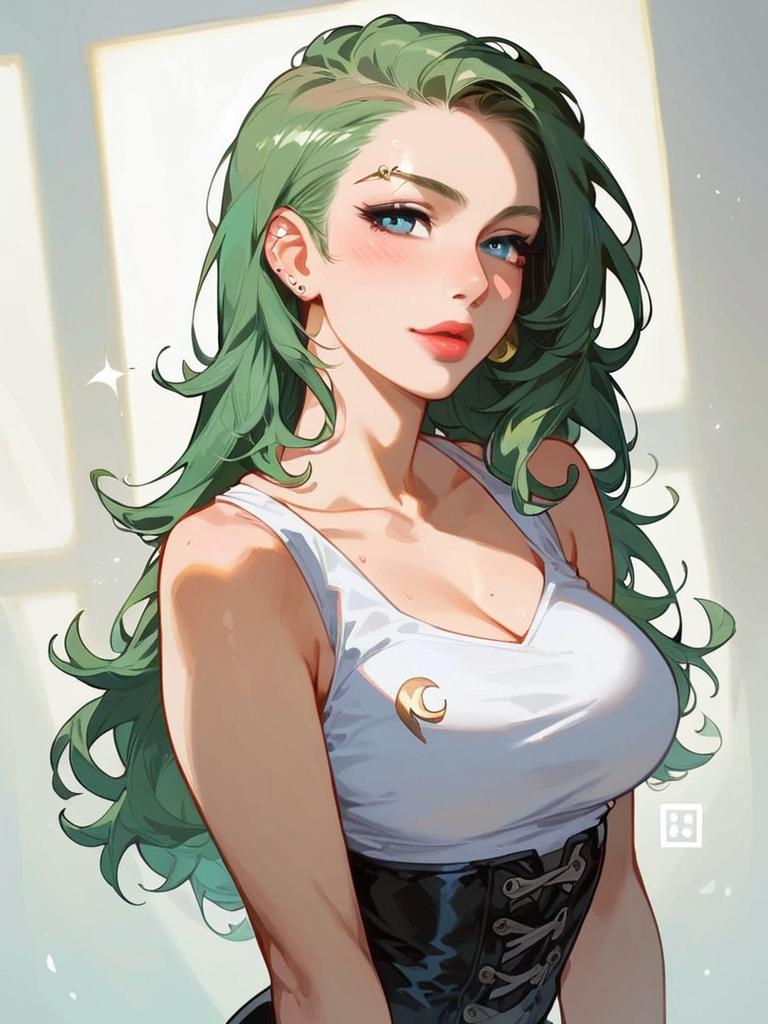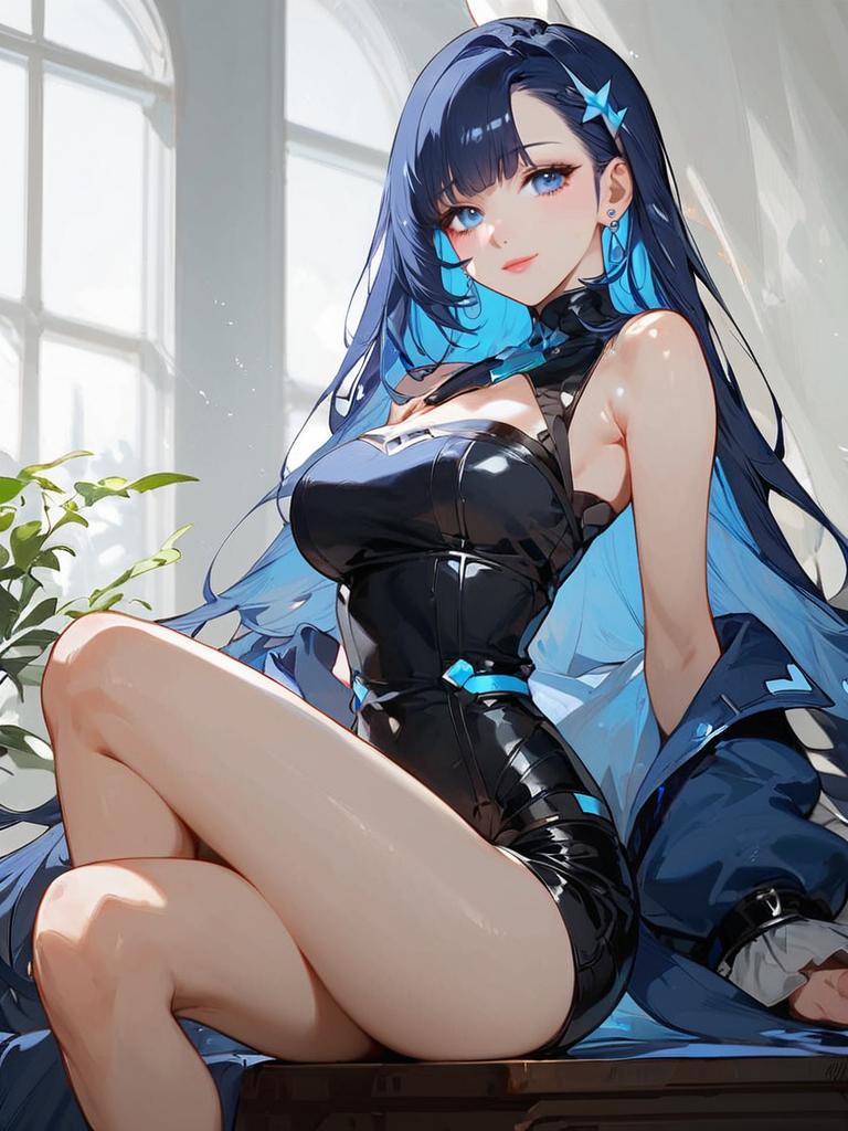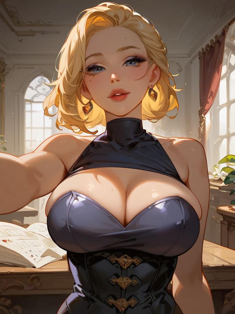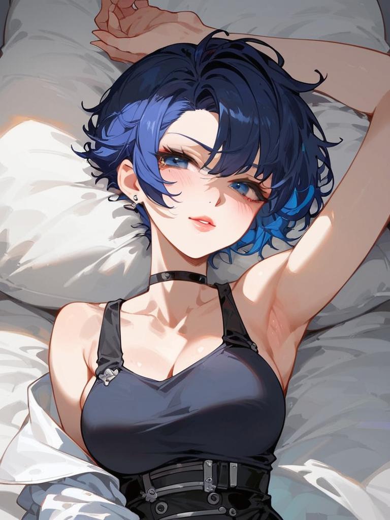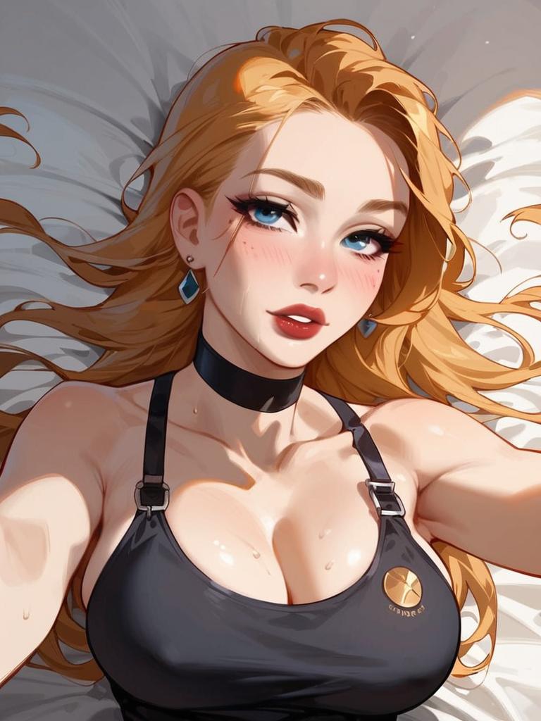 1girl woman wearing faux leather corset tank top with sci-fi control-panel print and structured seams paired with minimal low-rise briefs in obsidian black with holographic circuitry pattern on slender woman with asymmetrical haircut and glossy lips posed leaning back in the chair with arm extended to take the selfie in apartment bedroom corner with dresser and piles of clothing under bright white LED lighting illuminating face and outfit, playful sci-fi inspired cosplay portrait photography, high resolution, ultra-detailed