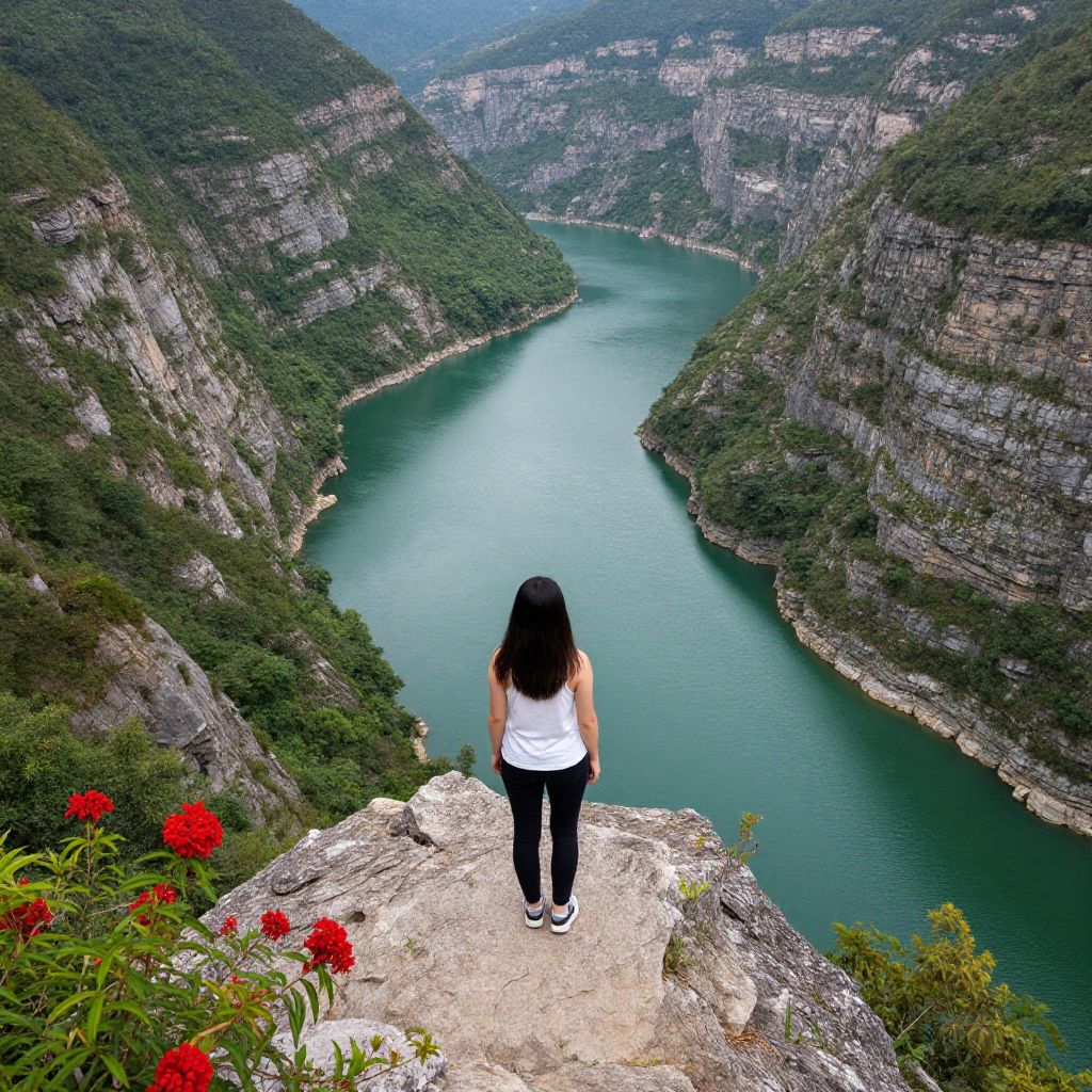 Woman standing on rocky outcrop overlooking serene turquoise canyon lake, framed by lush green cliffs and vibrant red flowers in the foreground.