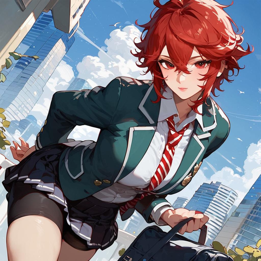 Score_9, score_8_up, score_7_up, source_anime, tomoaizawa, tomo aizawa, short hair, red eyes, hair between eyes, red hair, skirt, shirt, school uniform, jacket, white shirt, pleated skirt, necktie, striped, black skirt, blazer, red necktie, school bag, green jacket, striped necktie, green blazer, bike shorts, outdoors, cityscape, bent over, looking at viewer, dutch angle, cowboy shot