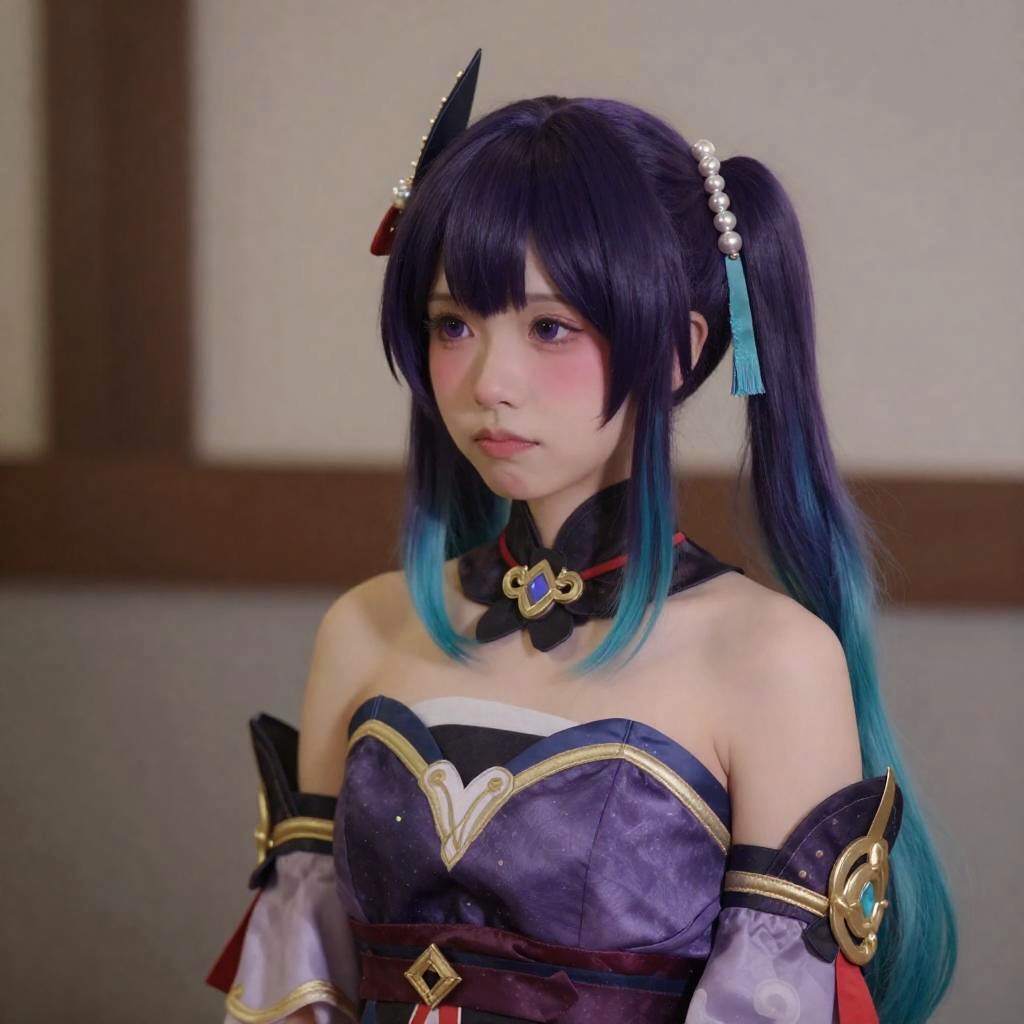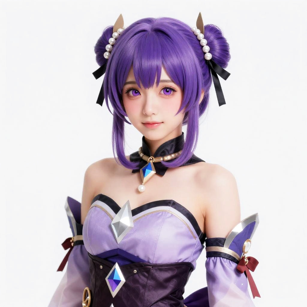 Upper body, aether genshin impact, 1girl, purple hair, twintails, hair bun, purple eyes, blush, strapless dress, detached sleeves, multicolored dress, pearl hair ornament, ribbon, purple, opal iridescent, crystalline prism facets, playful