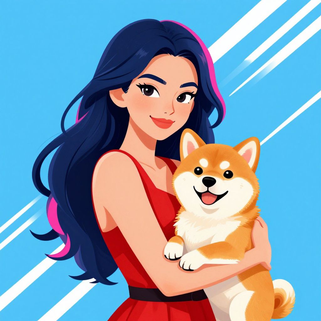 Digital illustration of an Asian woman with long, dark blue hair with pink highlights, wearing a sleeveless red dress, holding a cute, fluffy Shiba Inu dog with orange and white fur. The background is a bright blue with white diagonal lines. The woman has a confident smile, and the dog looks happy and content. The art style is vibrant and anime-inspired.