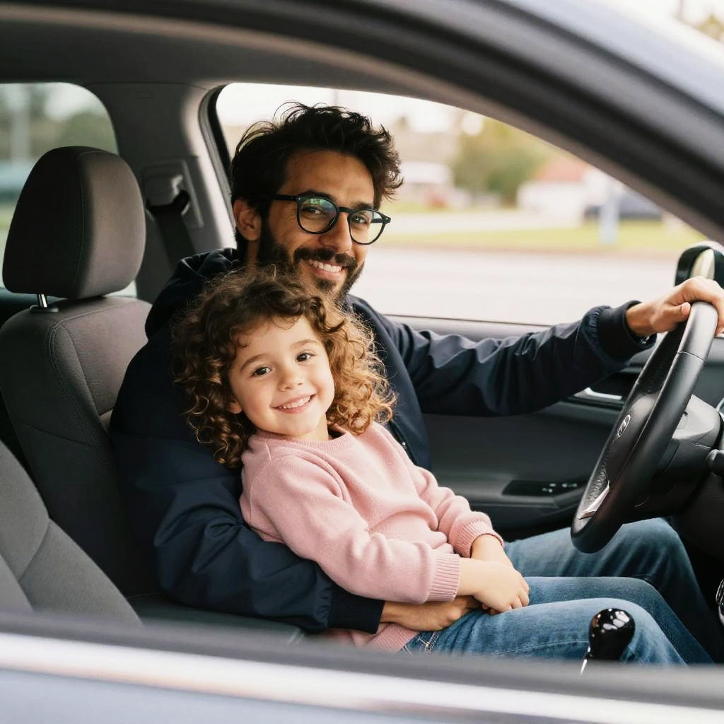 Photograph of a car's interior from the passenger's perspective. The driver, wearing a white shirt, has their hands on the steering wheel, while the passenger, in a black and white patterned sweater, rests their hand on the center console. The dashboard is visible with a blurred background of trees and sky through the windshield. The photo has a slightly grainy texture.