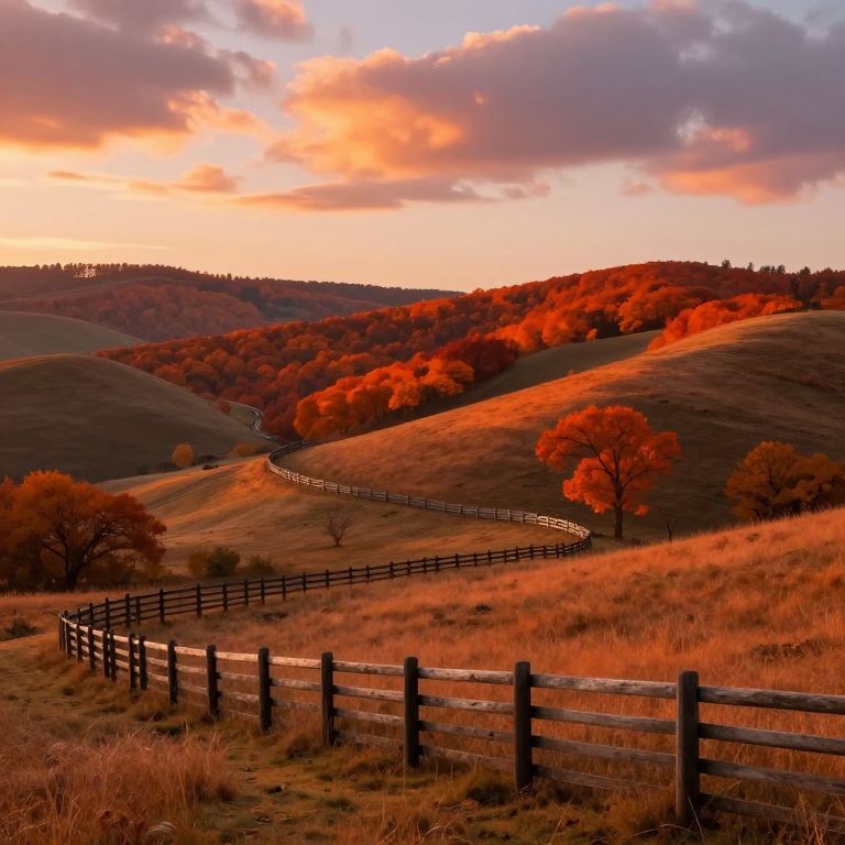 Fallbackground showcasing rolling hills blanketed in fiery autumn foliage, a wooden fence winding through the landscape, soft clouds glowing with sunset colors, a calm and inviting rural setting, intricate detail, digital art realism