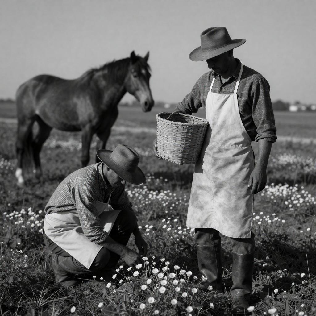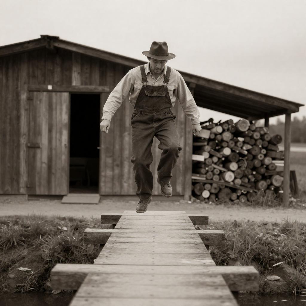 Sepia-toned photograph of a man in overalls and a hat, mid-leap, crossing a wooden plank bridge. Background includes a rustic wooden shed and stacked lumber. The man's dynamic pose contrasts with the stillness of the surrounding objects.