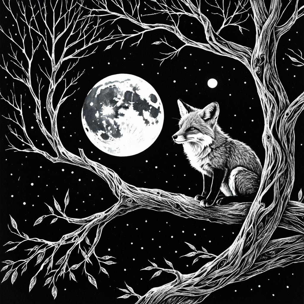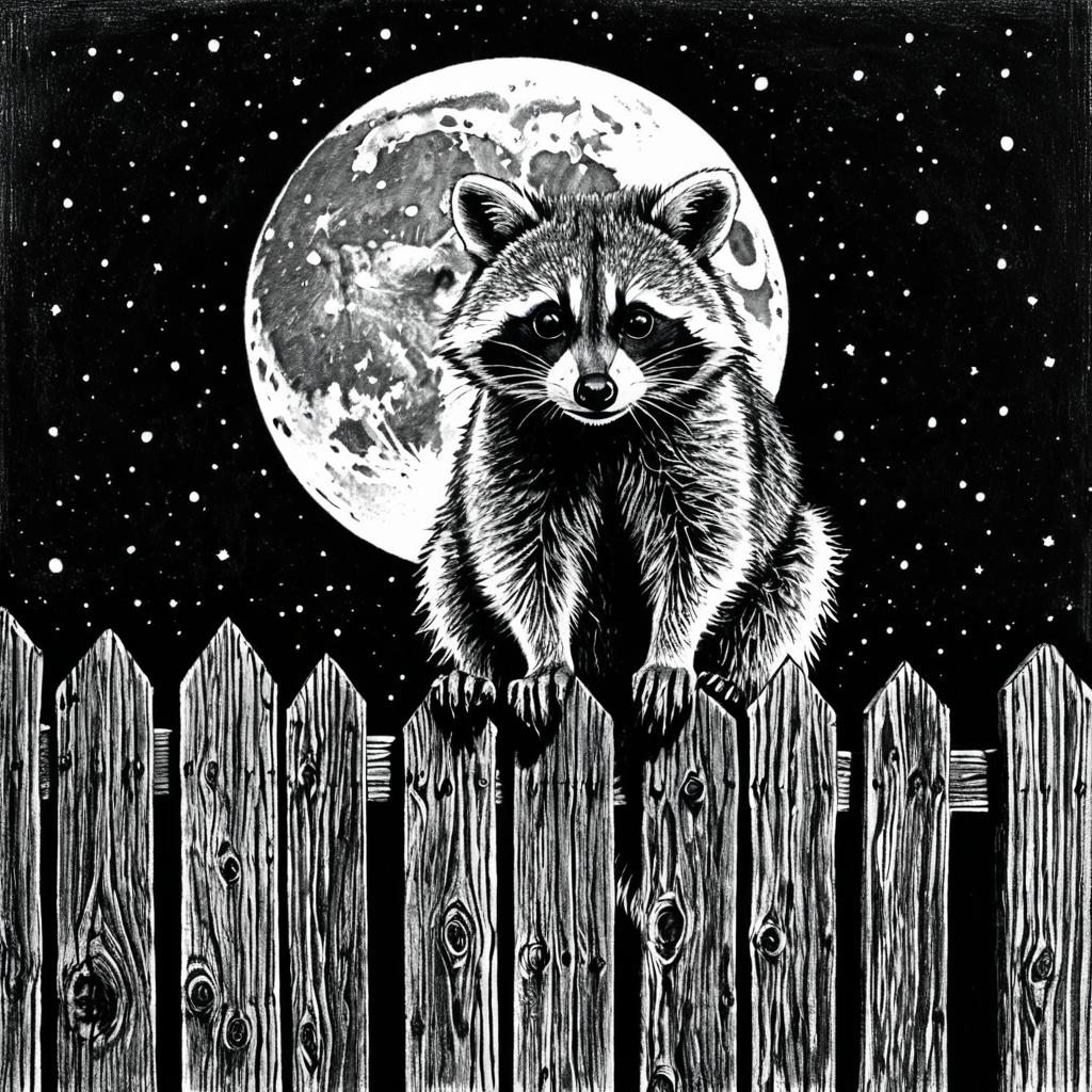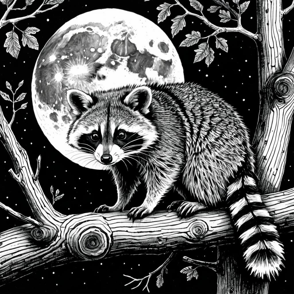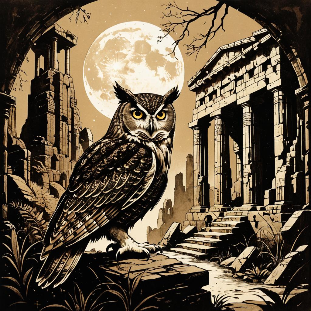 Intricate pen and ink drawing of a enigmatic raven perched on ancient ruins, with the moon glowing softly in the background, gleaming eyes and shattered stone textures.