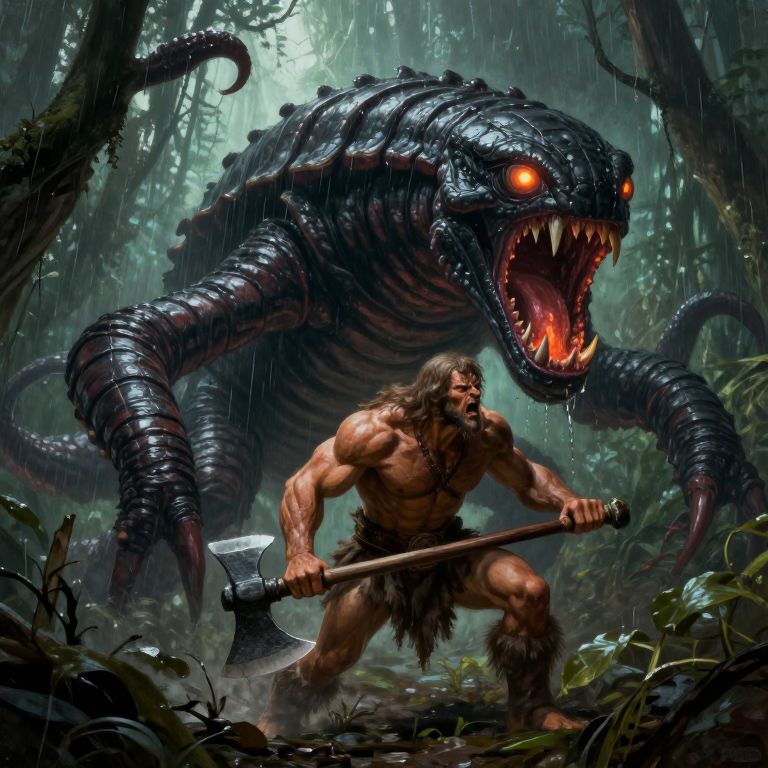 Comic book style 8k high quality digital painting, best quality very detailed epic masterpiece, Boris Vallejo style, retro artstyle, best quality full body, very detailed masterpiece, RetroSci style, a prehistoric warrior is attacked by a giant black worm-like monster with long tentacles and glowing eyes, its mouth is glowing from inside, has a shell on its back, fangs, saliva, muscle-warrior, fur loincloth, big axe, defensive position, rain forest, swamp, little suinlight coming through the trees, dark athmosphere, retro oil painting style, reduced saturation, dramatic lighting, sureal mood, scary, realistic realistic, realism, photo realistic oil painting, photo realistic painting, scary scene, action, scary, epic scene, Dungeons and dragons atmosphere, heroic fantasy, fnastyle, Comic book style