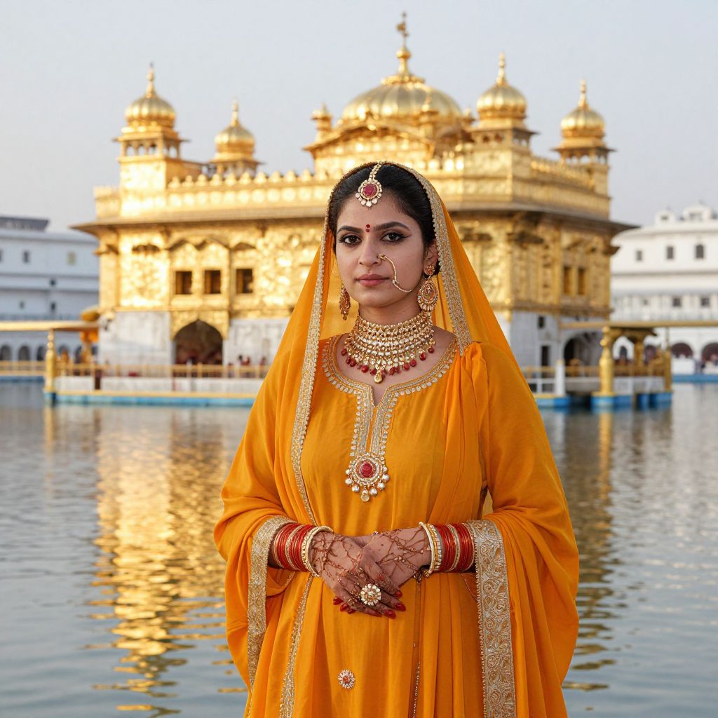 A Sikh woman adorned in vibrant orange attire and intricate jewelry stands gracefully against the serene backdrop of the Golden Temple in Amritsar, India, captured in high-definition editorial photography that highlights the golden hour's warm, reflective lighting.