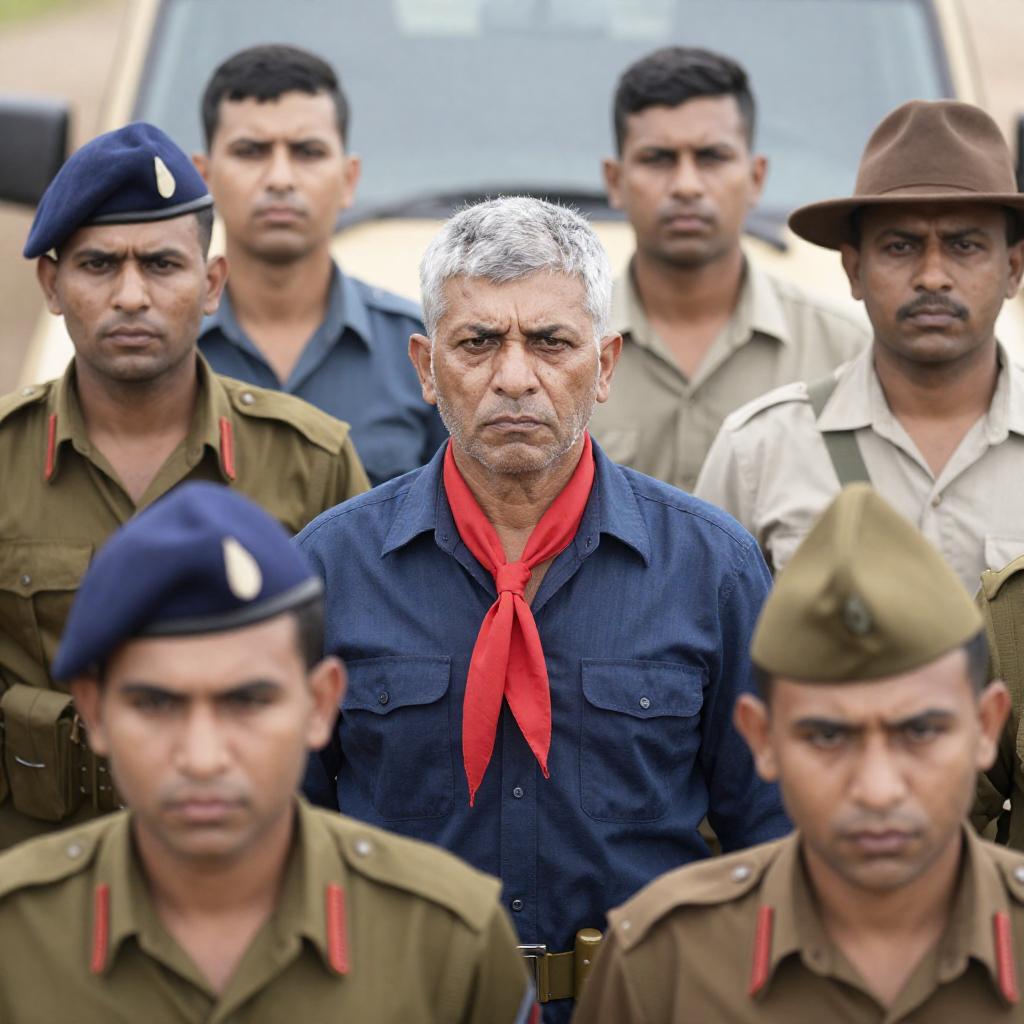 Photograph of six men in a crowded outdoor setting. Foreground: two men with military-style hats, one with a blue beret. Central figure: grey-haired man in blue shirt, red scarf, stern expression. Right: man in brown hat, beige shirt. Background: four men in varied clothing, some with hats. Visible military gear, including ammo belts. Background includes a large vehicle. Men have serious, attentive expressions.