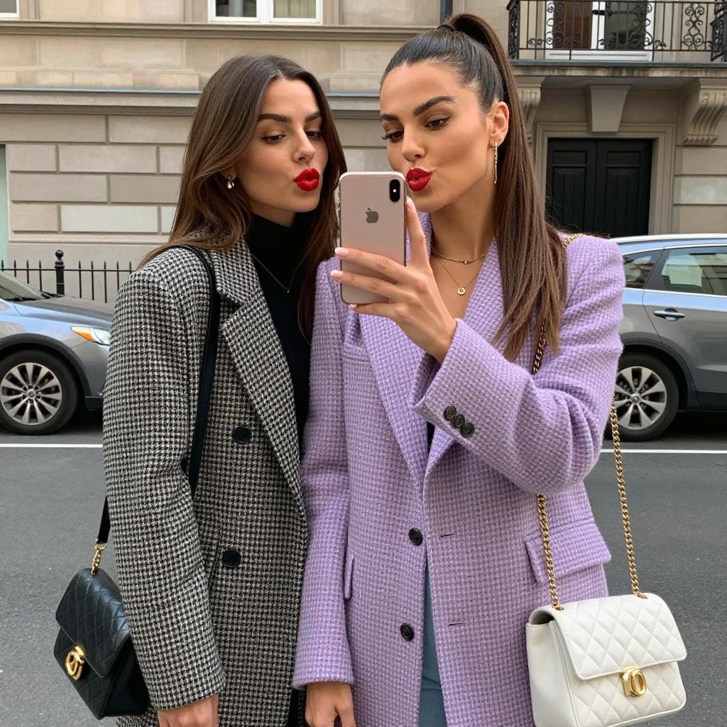Two women walking on a city sidewalk. The woman on the left has long brown hair, wears dark sunglasses, a black coat, black shorts, and white knee-high boots. She holds a phone and a small bag. The woman on the right has long brown hair, wears dark sunglasses, a black leather jacket, black shorts, black boots, and carries a black handbag with a chain strap. Both women are looking at their phones. Reflections of buildings and streetlights are in the background glass window.
