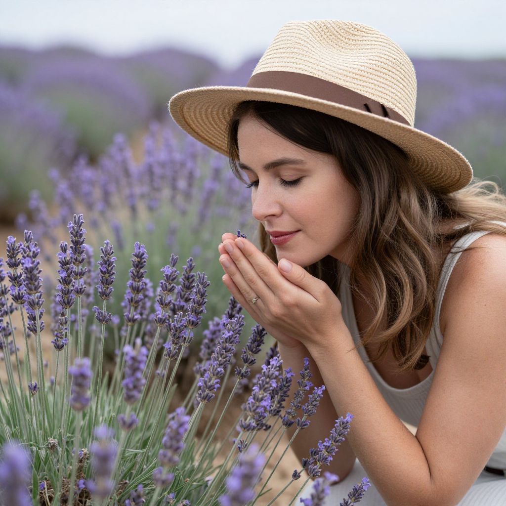 Photograph of a young woman with light brown skin and wavy brown hair, wearing a beige straw hat and a white sleeveless top, kneeling in a lavender field. She is gently cupping her hands close to her face, smiling softly as she admires the purple lavender flowers in front of her. The background is a blur of more lavender, creating a serene, natural setting. The image has a soft focus and warm color palette, emphasizing the peaceful, joyful moment.