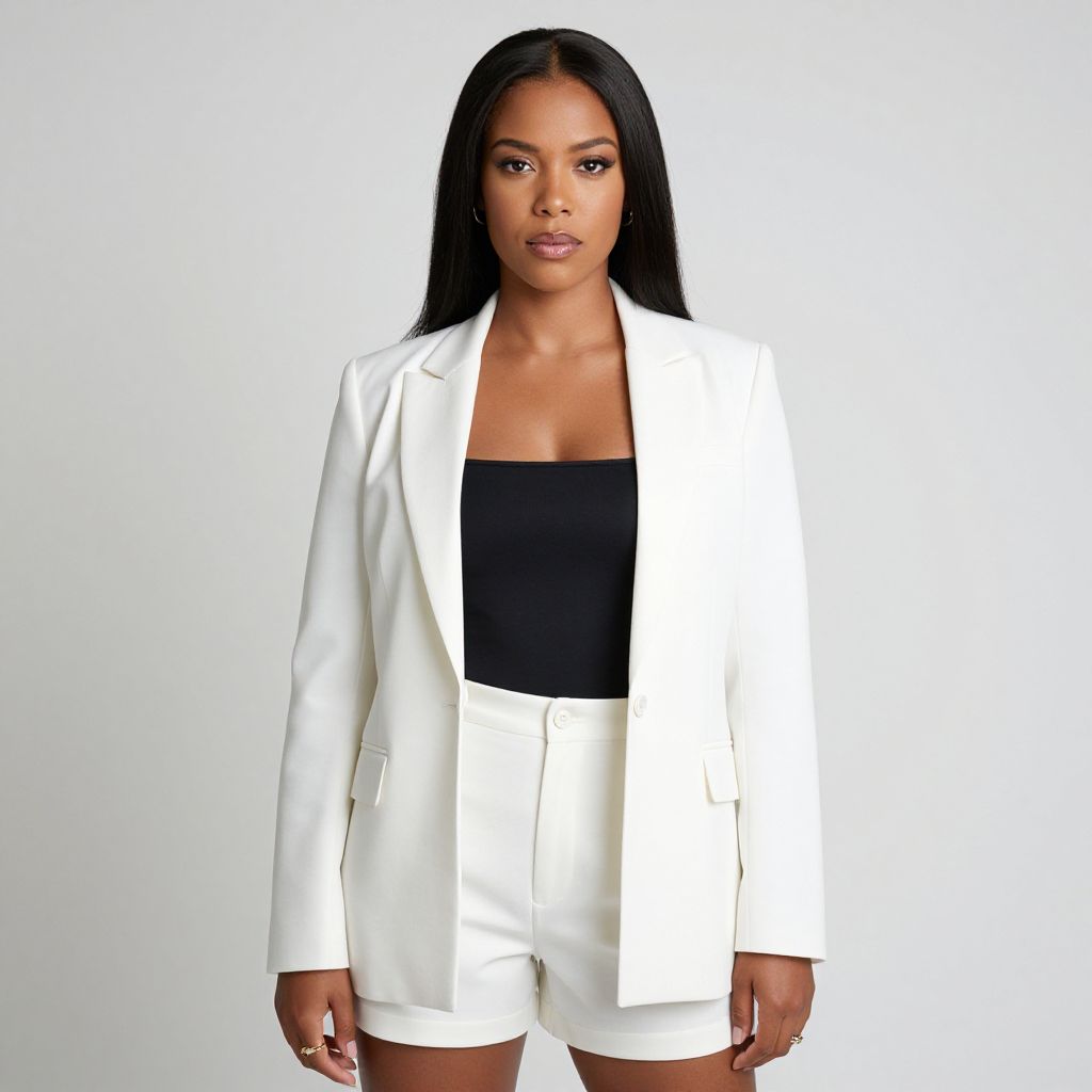 Photograph of a confident woman with medium brown skin and long black hair. She's wearing a crisp white blazer over a black top and white shorts, standing against a plain white background. She has a serious expression, and her right hand is slightly clenched, holding a gold ring. The overall look is chic and stylish.