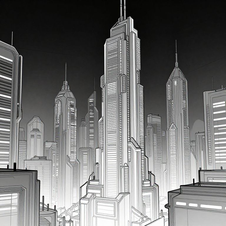 Black-and-white digital drawing of a futuristic city skyline at night, featuring tall, illuminated skyscrapers with sleek, modern architecture.