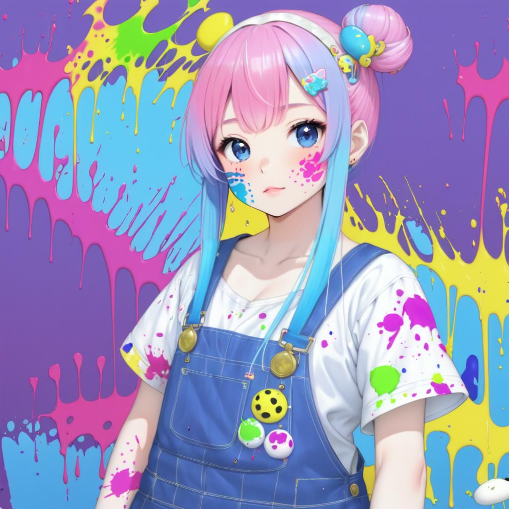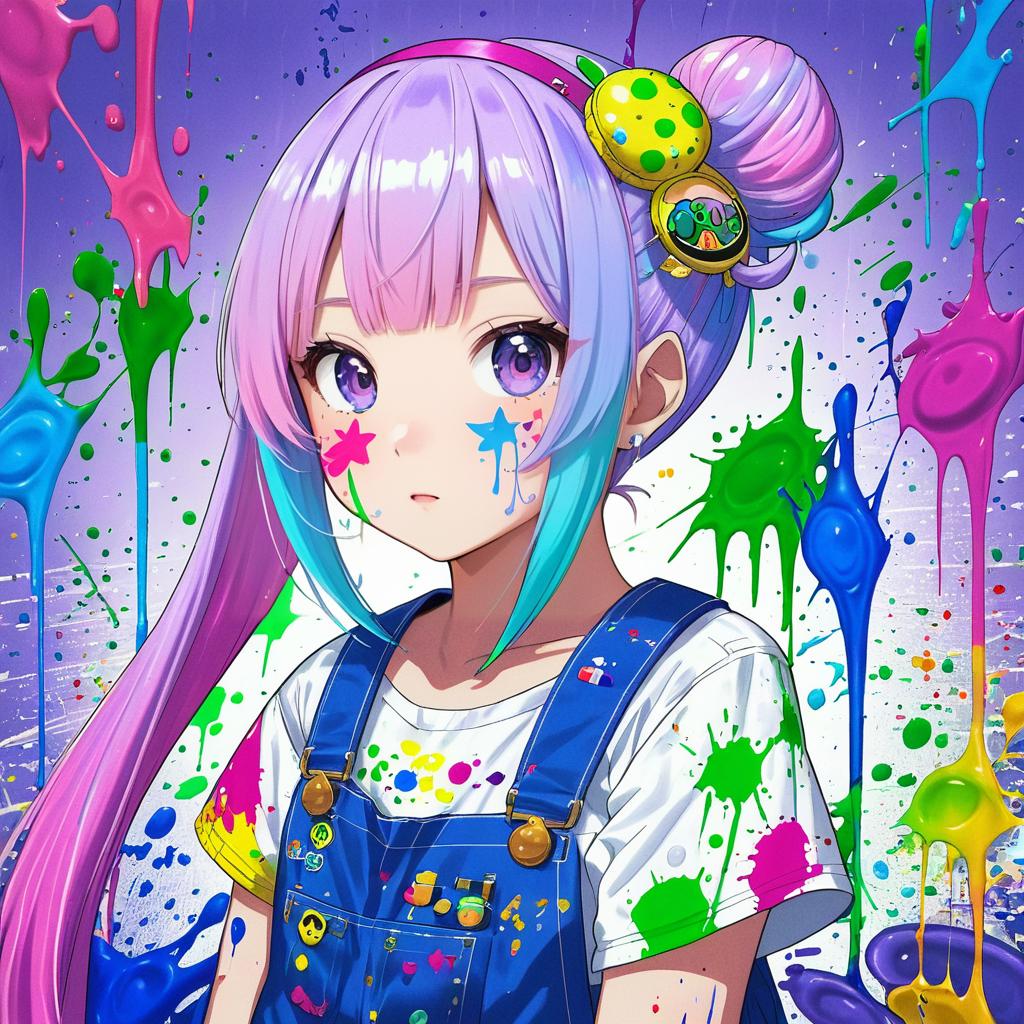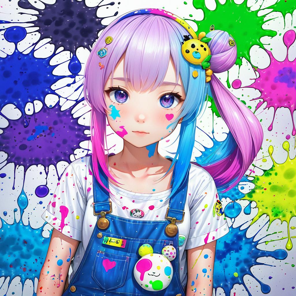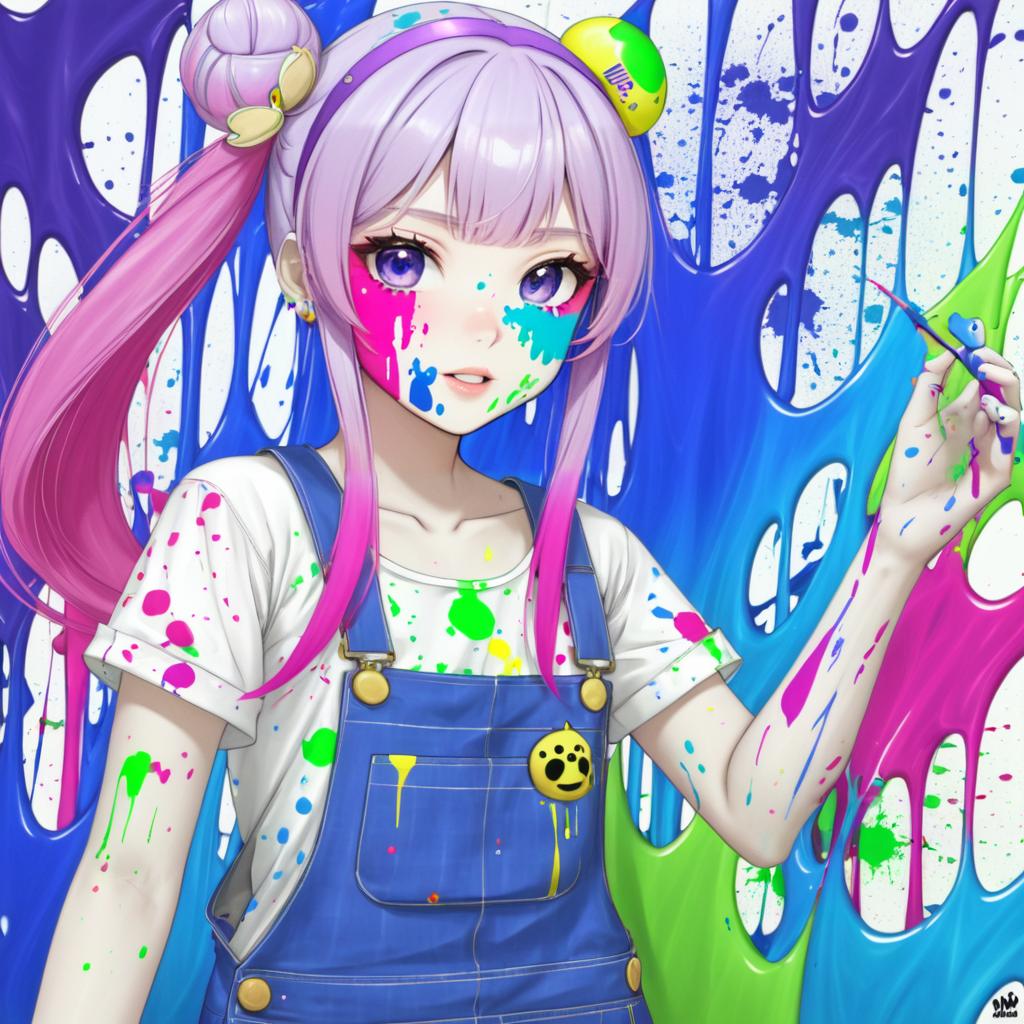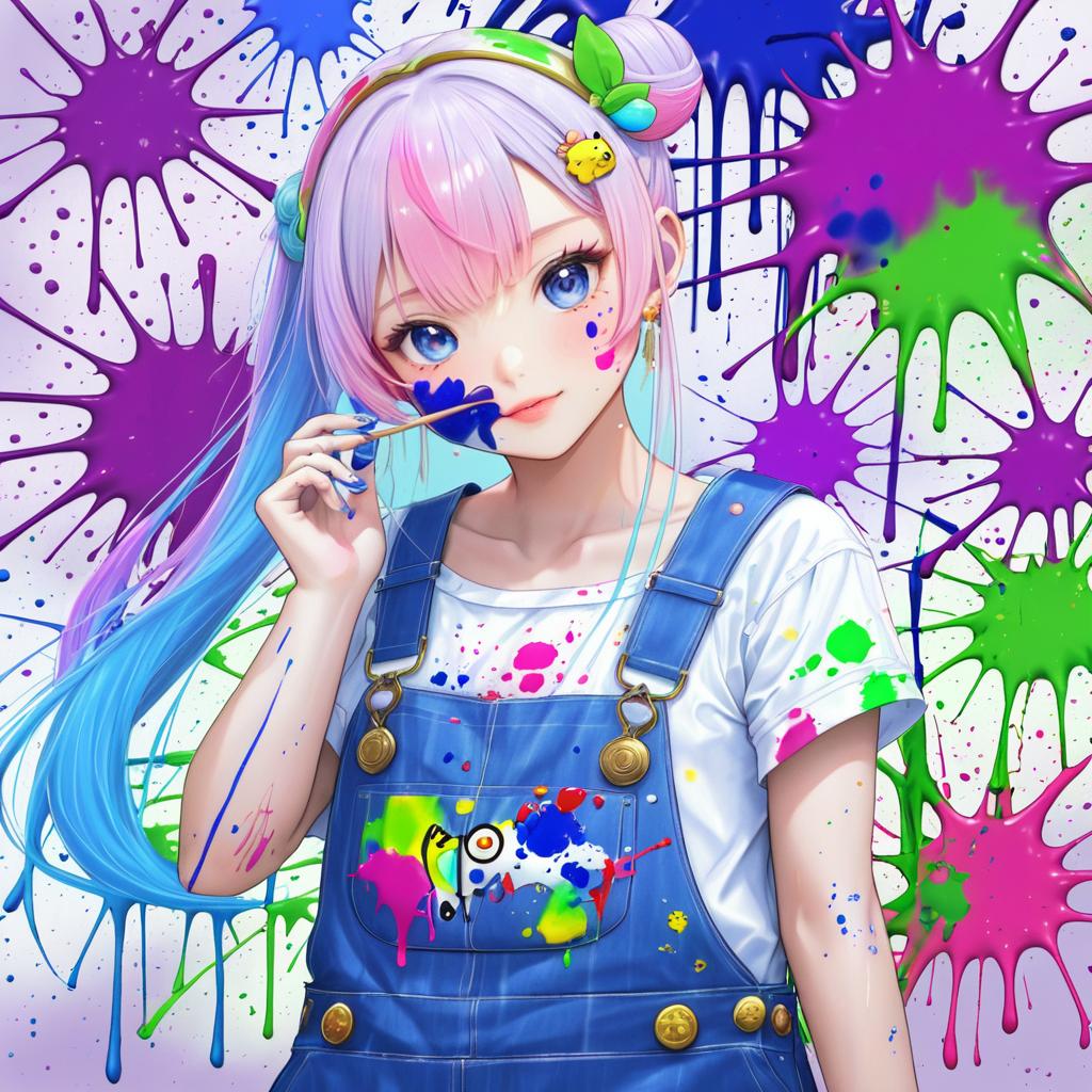 Airani iofifteen (1st costume), hololive, 1girl, purple eyes, pink hair, long hair, gradient hair, blue hair, single hair bun, palette hair ornament, side ponytail, single side bun, hair ornament, hairband, medium breasts, collarbone, white shirt, virtual youtuber, virtual youtuber, paint splatter on face, overalls, by artist vento, anime