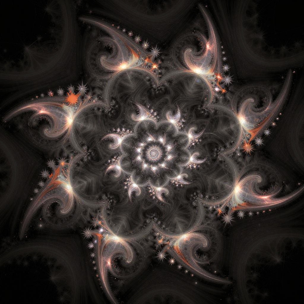 Fractal art generator visualizing kaleidoscopic fractal landscapes with fractal flames and glowing accents, blending smooth organic curves with sharp geometric edges, illuminated by ethereal light sources in a dark abstract setting.