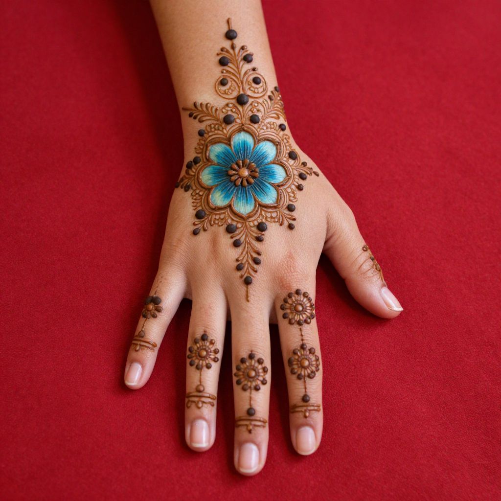 Photograph of a hand with intricate blue and black henna designs, featuring a central blue flower, on a red fabric background.