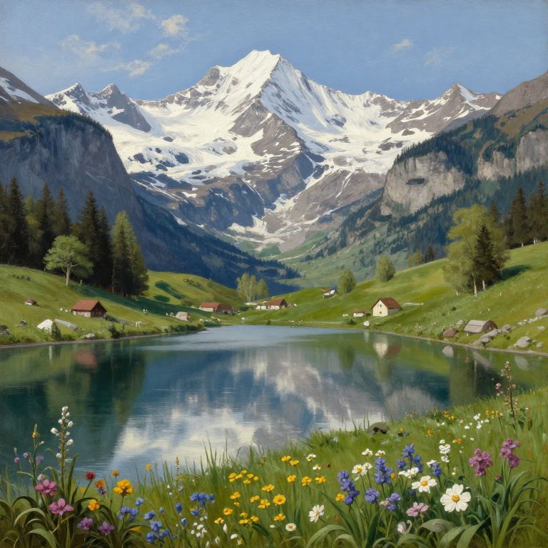 This is a vivid, digital painting of a picturesque mountain landscape. In the foreground, a calm lake reflects the surrounding scenery, bordered by colorful wildflowers including yellow, white, blue, and purple blooms. Mid-ground features lush green hills dotted with small, red-roofed cabins and trees. The background showcases towering, snow-capped mountains under a bright blue sky with scattered clouds. The scene is serene, with rich greenery, clear water, and the majestic mountains creating a tranquil, idyllic setting.
