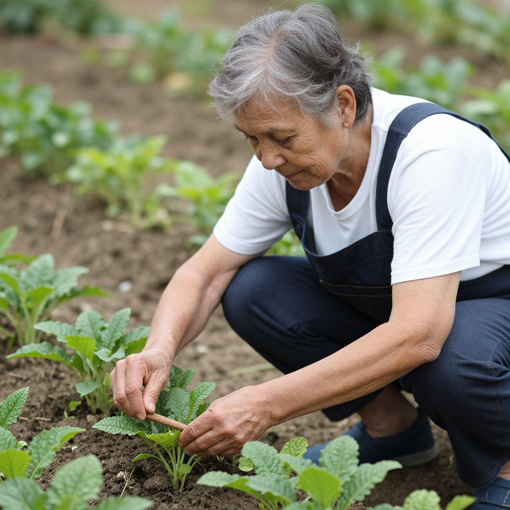 Senior woman crouching in a lush garden, attentively tending to young green plants while wearing a white shirt and dark overalls, her hands gently holding a small wooden stick.